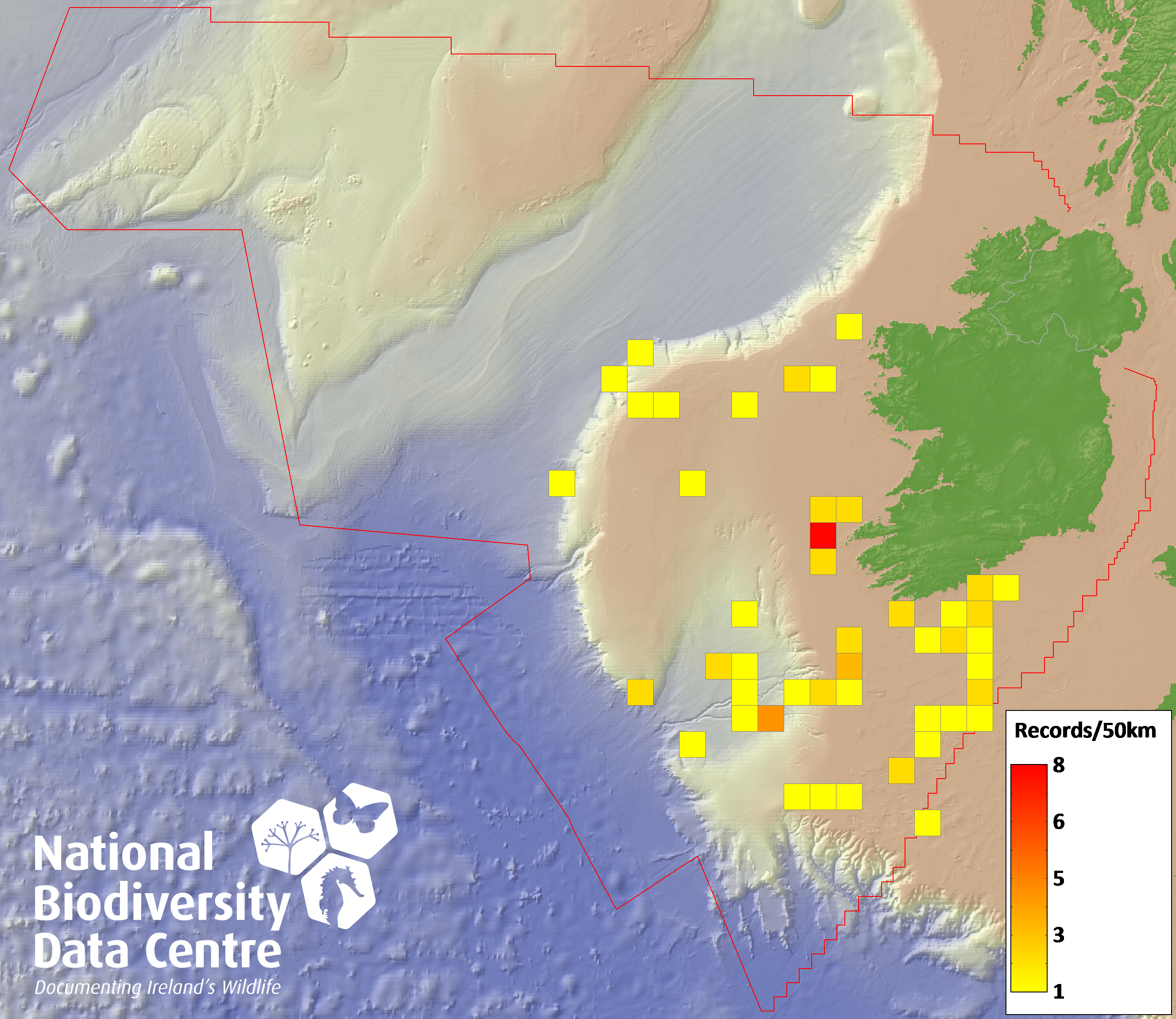 Distribution of the number of records recorded within each 10km grid square (ITM).Marine Map - 50km