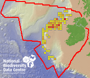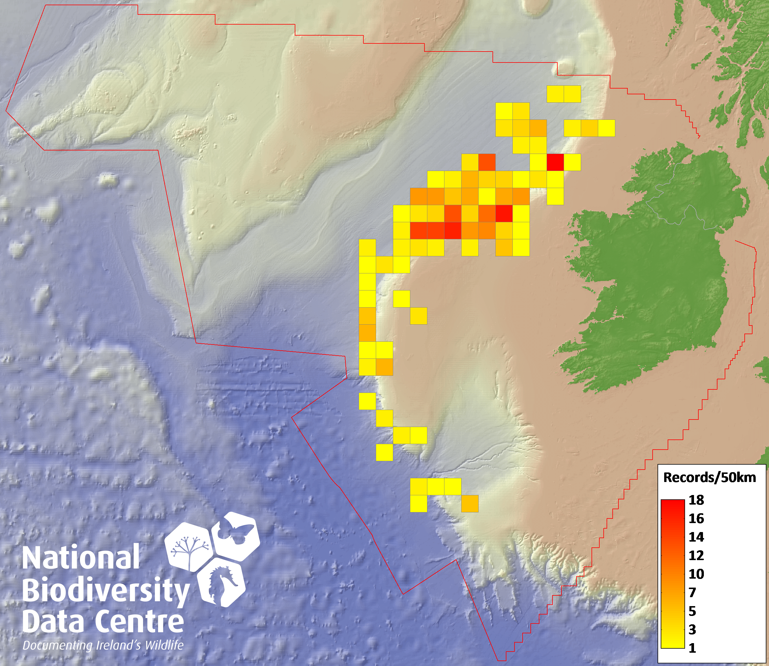 Distribution of the number of records within each 10km grid square (ITM).Marine Map - 50Km