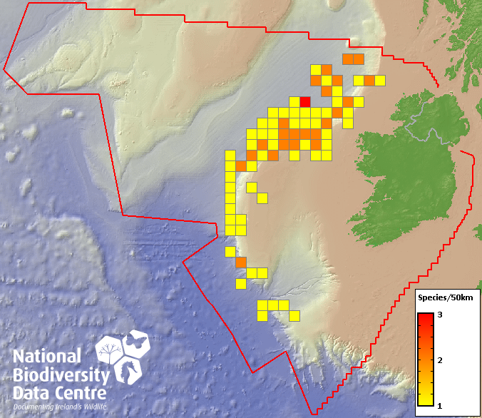 Distribution of the number of records within each 10km grid square (ITM).Marine Map - 50Km
