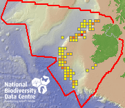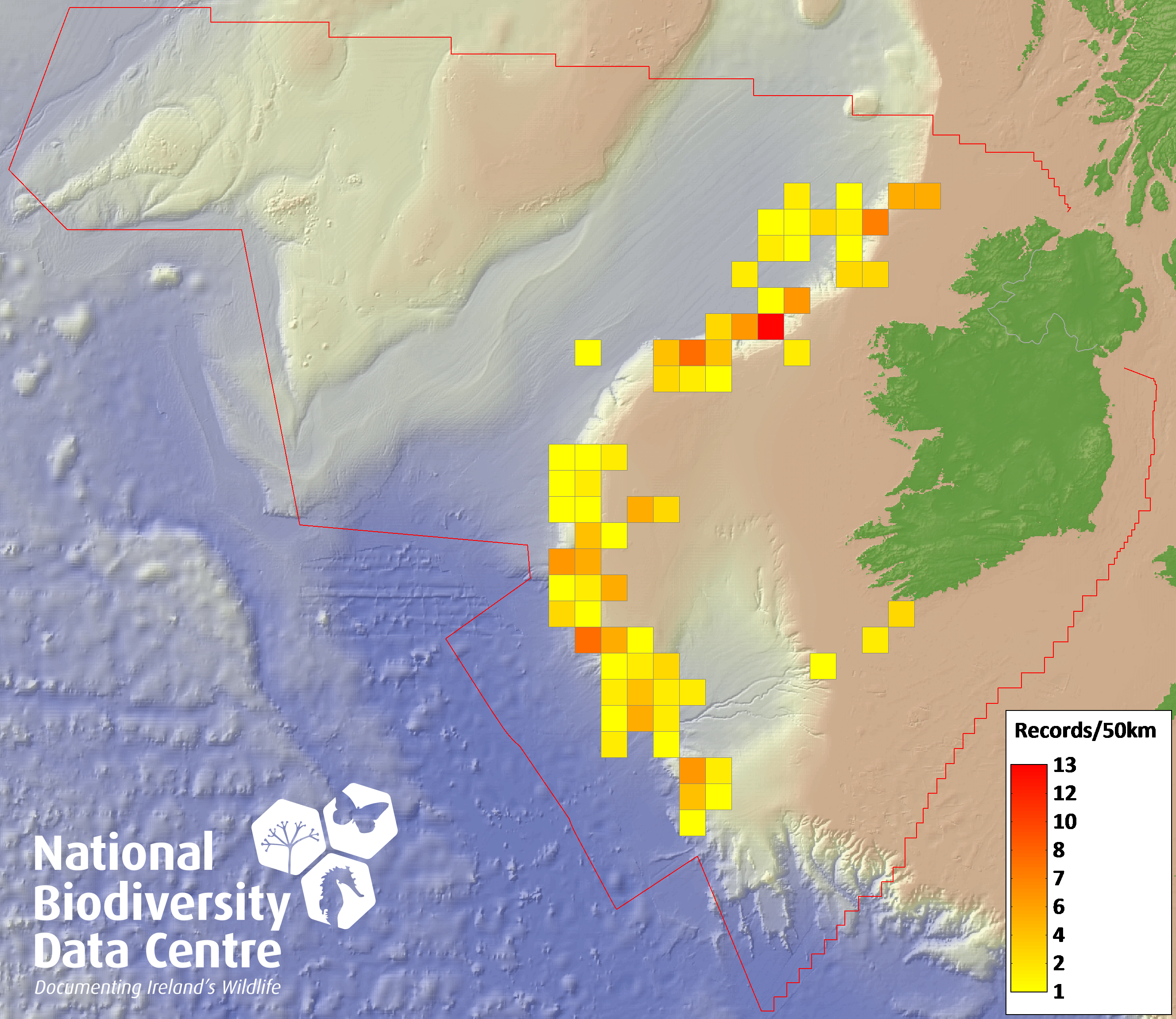 Distribution of the number of records within each 10km grid square (ITM).Marine Map - 50Km