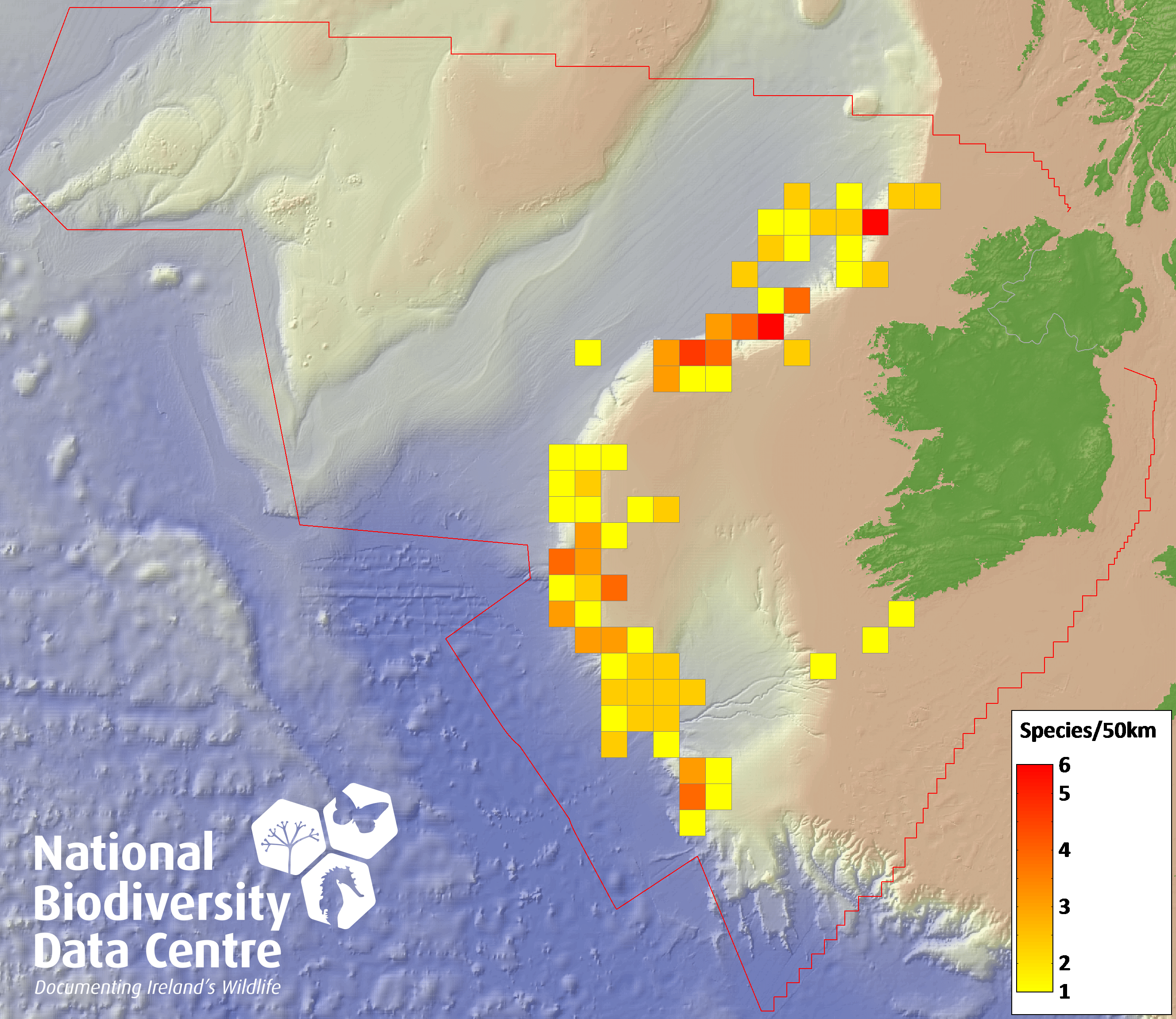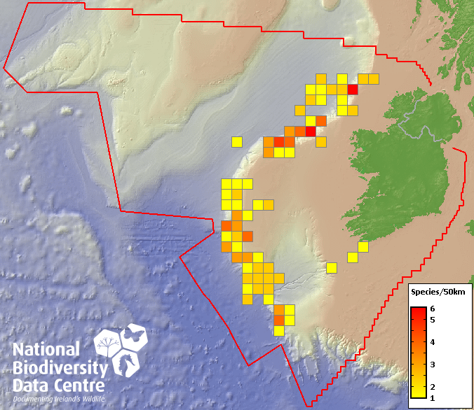 Distribution of the number of species recorded within each 10km grid square (ITM).Marine Map - 50Km
