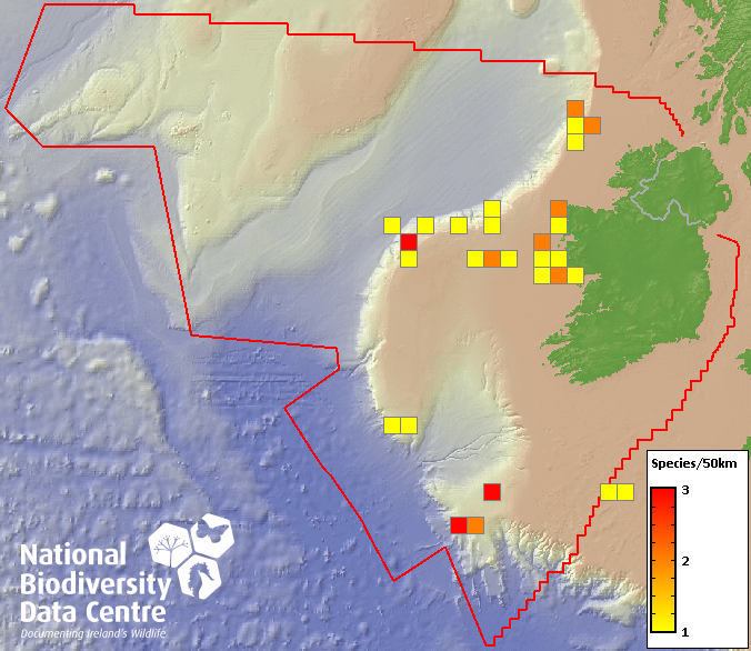 Distribution of the number of records within each 10km grid square (ITM).Marine Map - 50Km