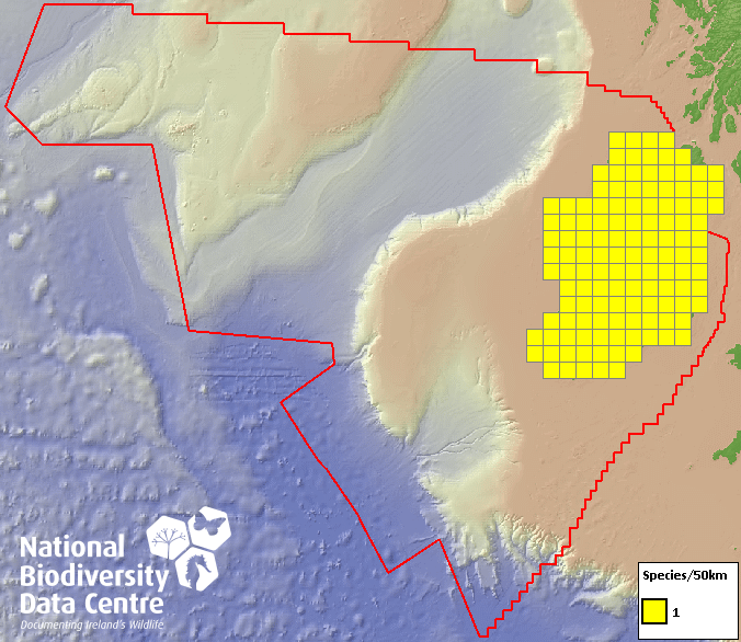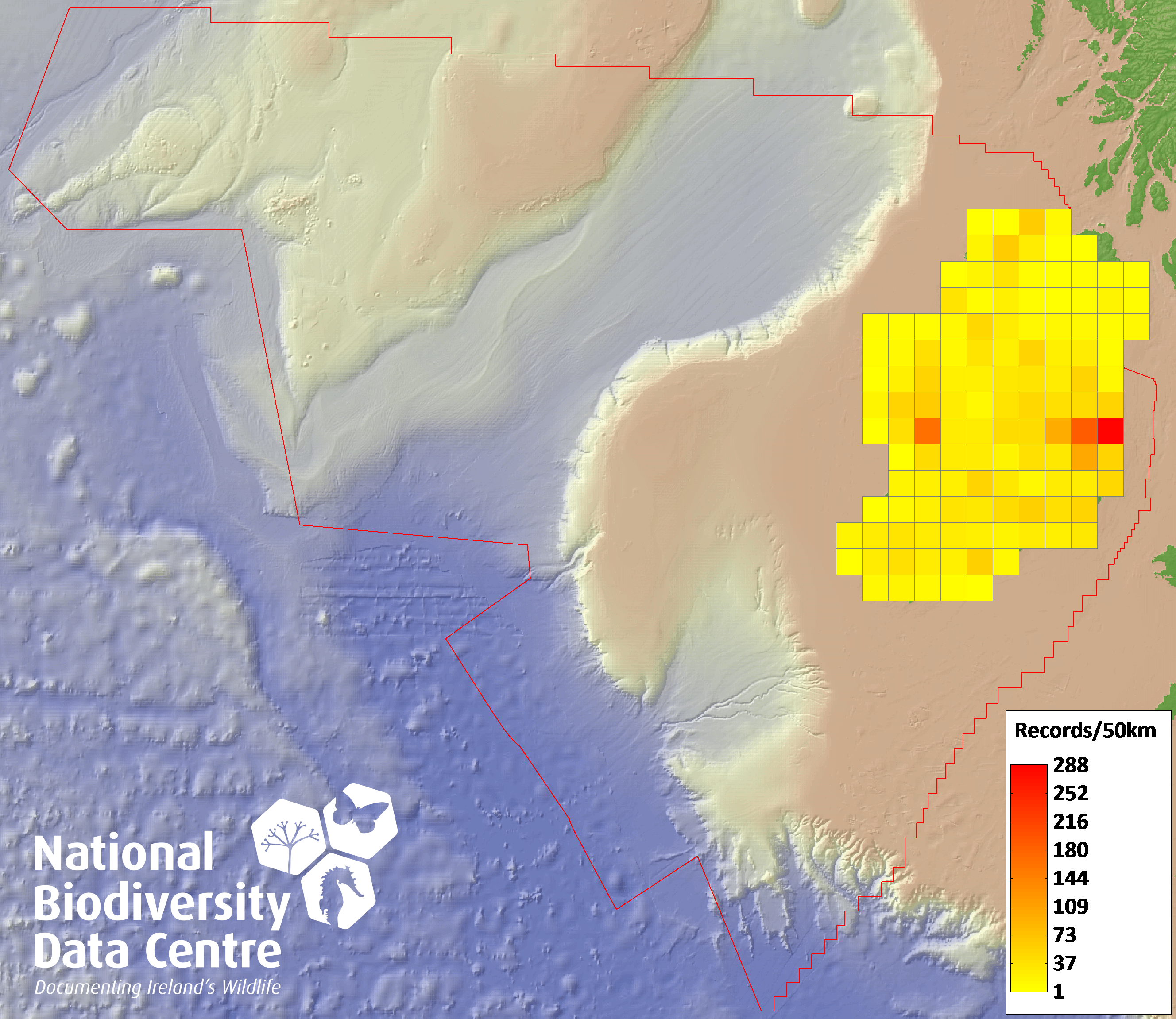 Distribution of the number of records within each 10km grid square (ITM).Marine Map - 50Km
