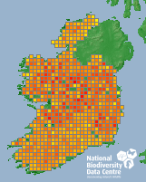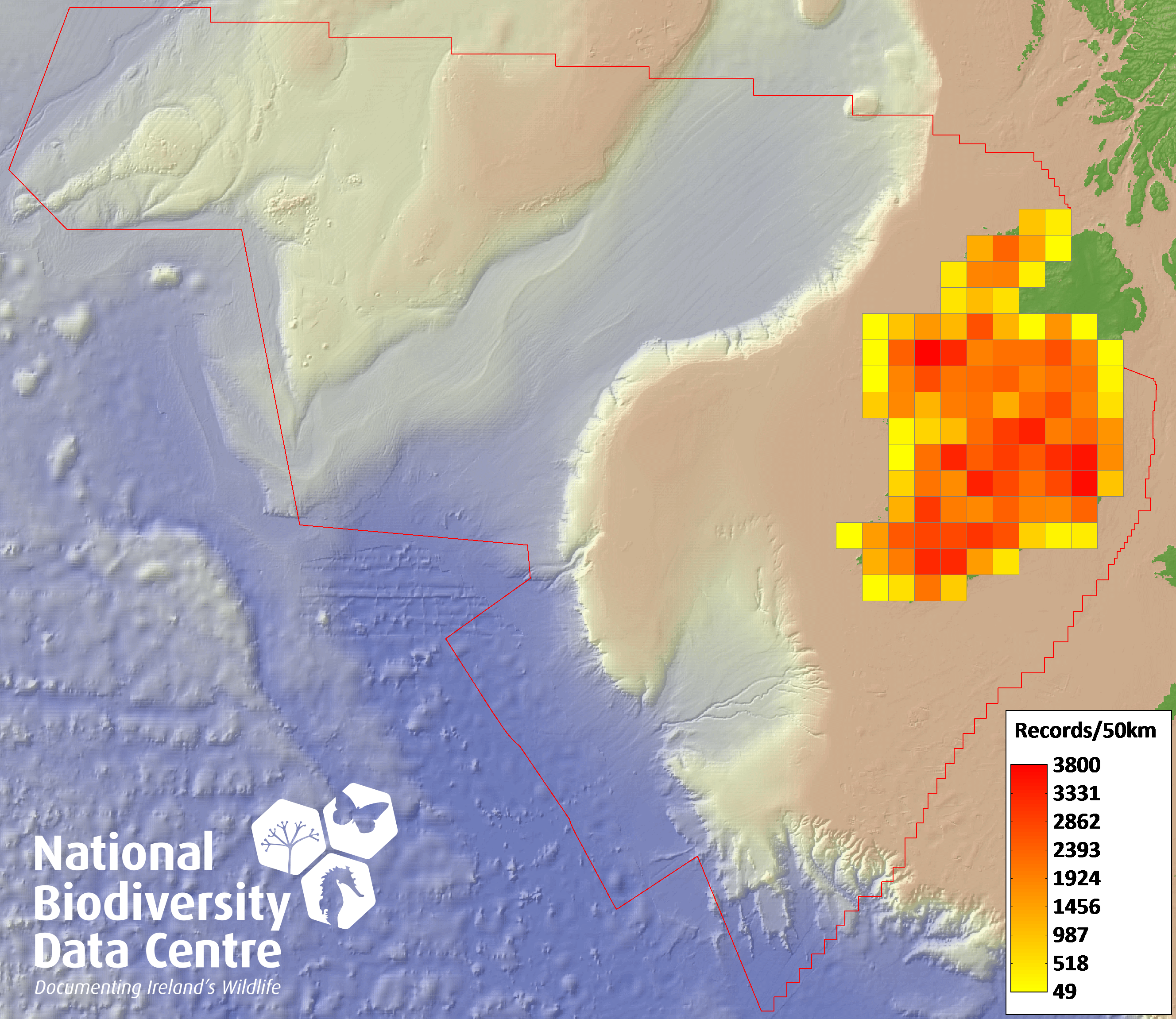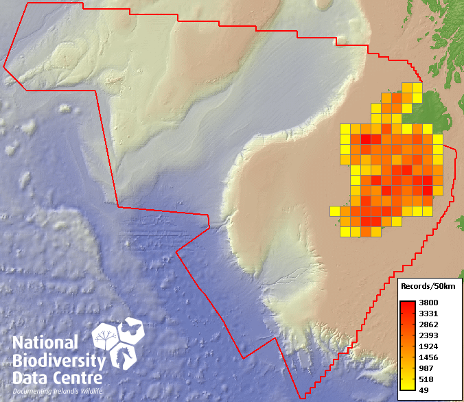 Distribution of the number of records within each 10km grid square (ITM).Marine Map - 50Km