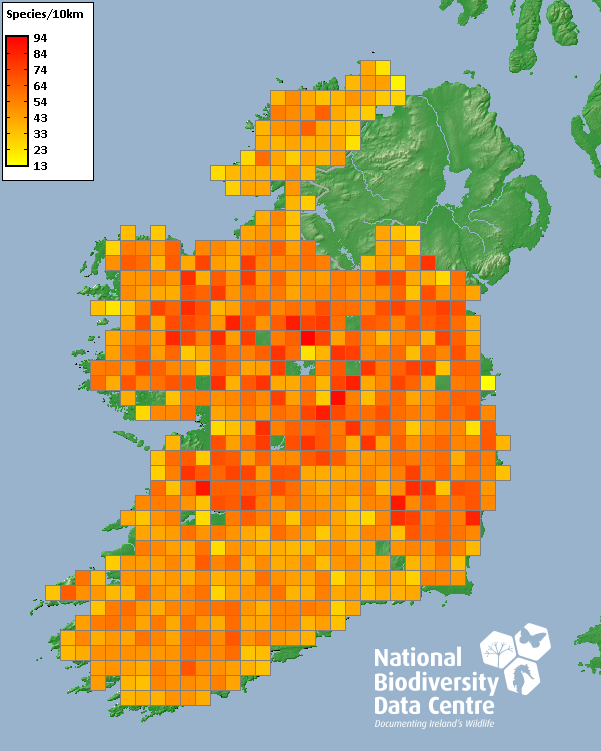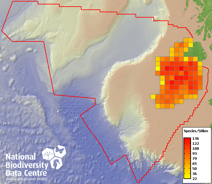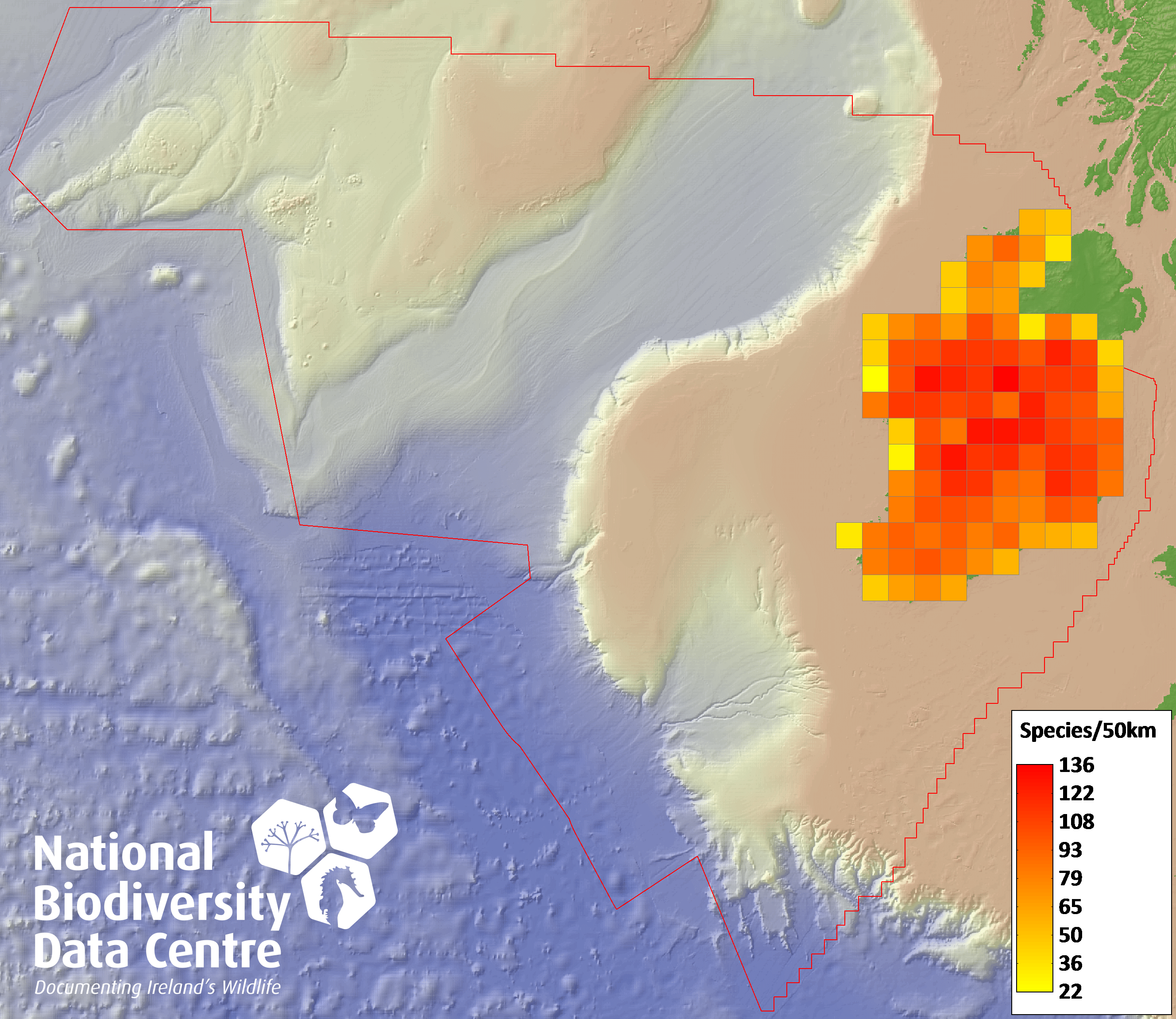 Distribution of the number of species recorded within each 10km grid square (ITM).Marine Map - 50Km