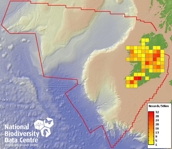 Distribution of the number of records recorded within each 10km grid square (ITM).Marine Map - 50km