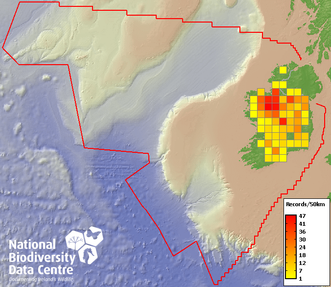 Distribution of the number of records recorded within each 10km grid square (ITM).Marine Map - 50km
