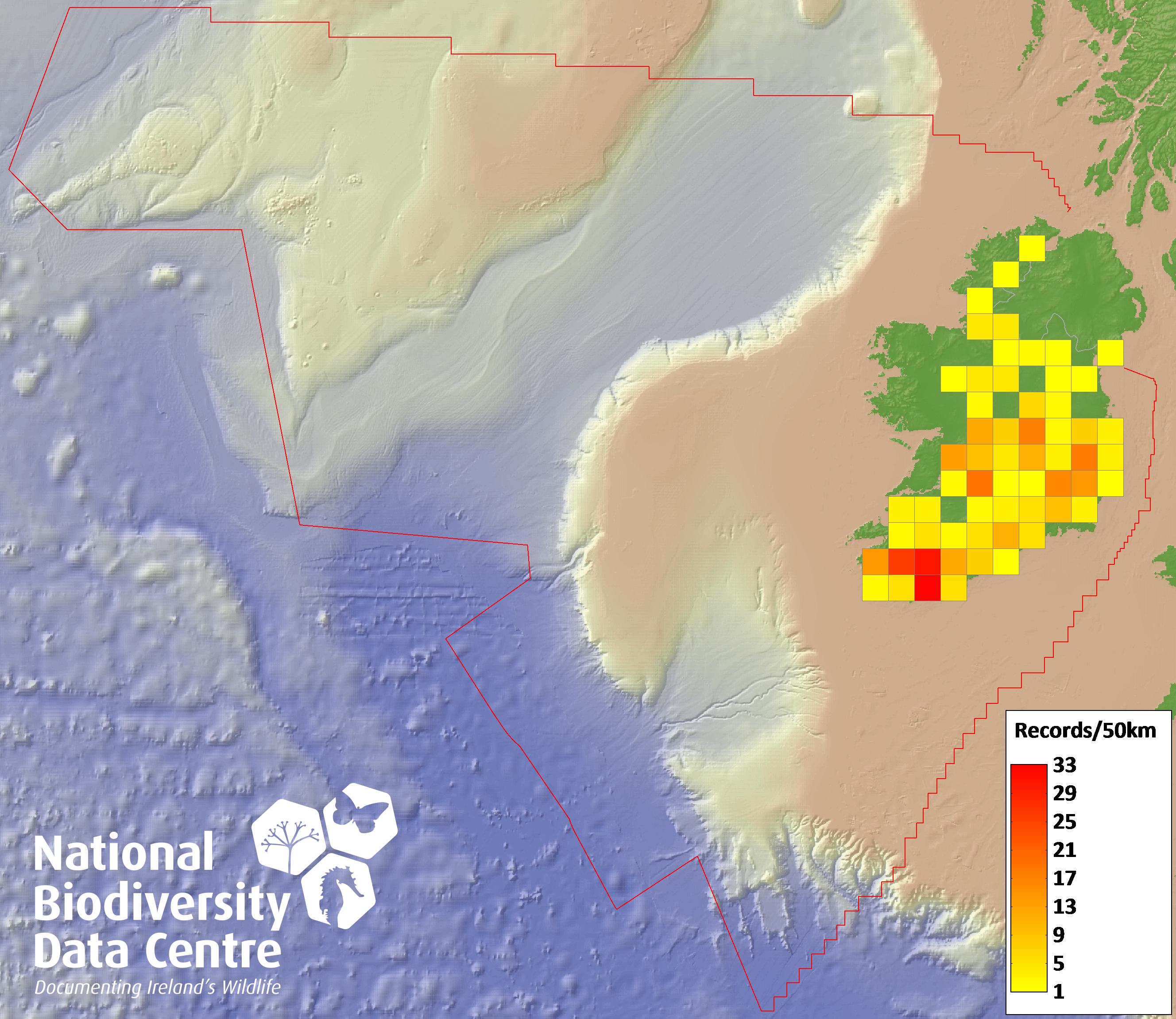 Distribution of the number of records recorded within each 10km grid square (ITM).Marine Map - 50km