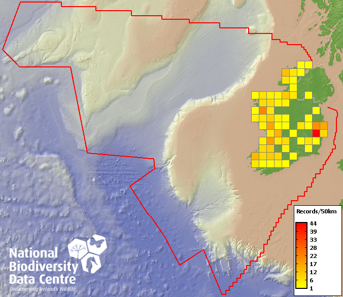 Distribution of the number of records recorded within each 10km grid square (ITM).Marine Map - 50km