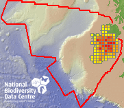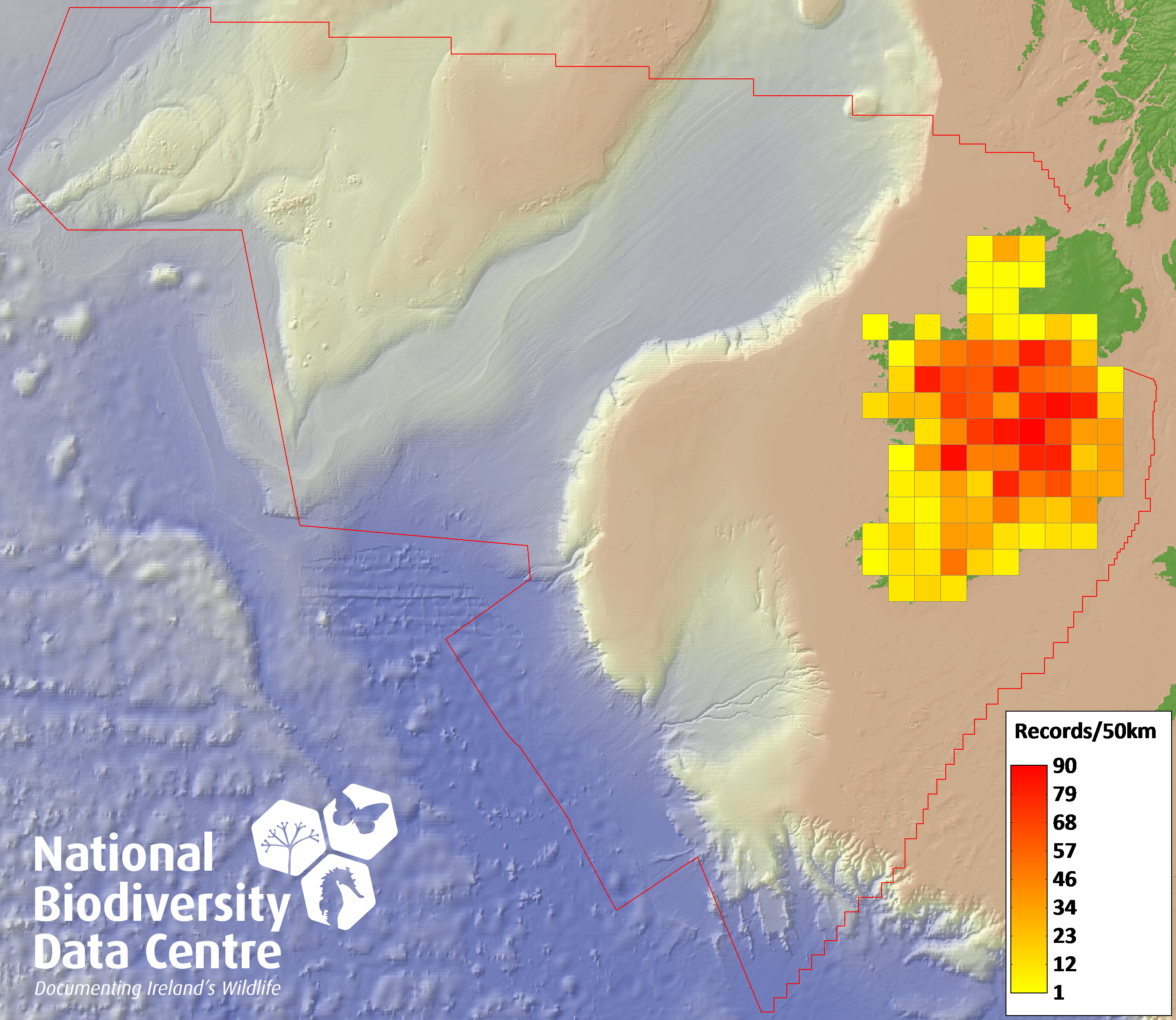 Distribution of the number of records recorded within each 10km grid square (ITM).Marine Map - 50km