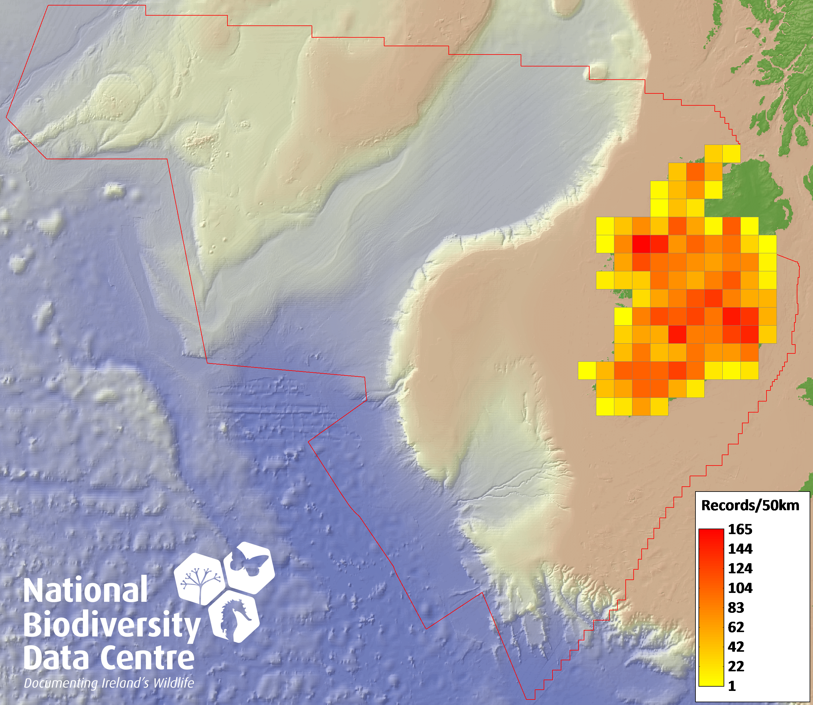 Distribution of the number of records recorded within each 10km grid square (ITM).Marine Map - 50km