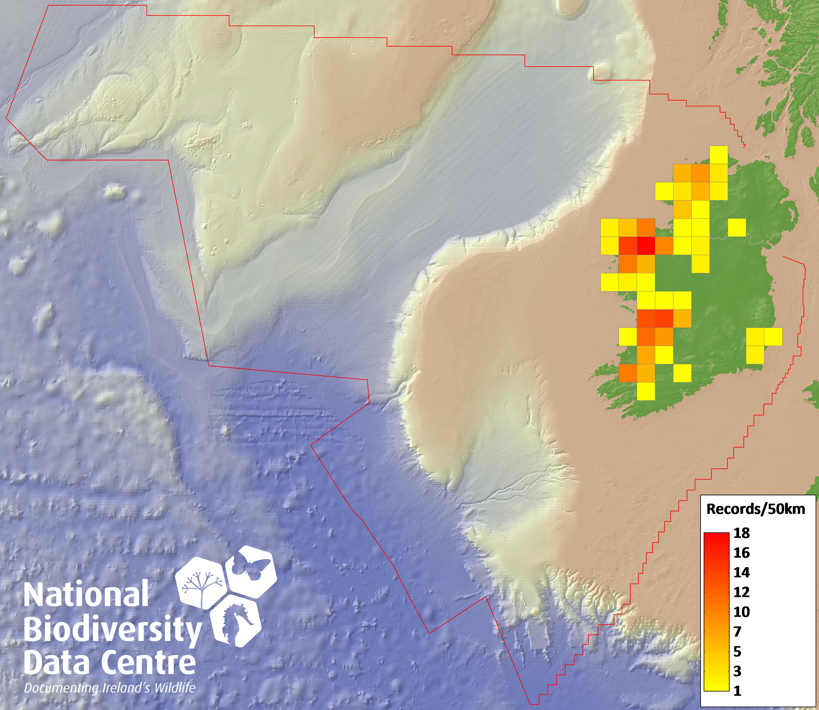 Distribution of the number of records recorded within each 10km grid square (ITM).Marine Map - 50km