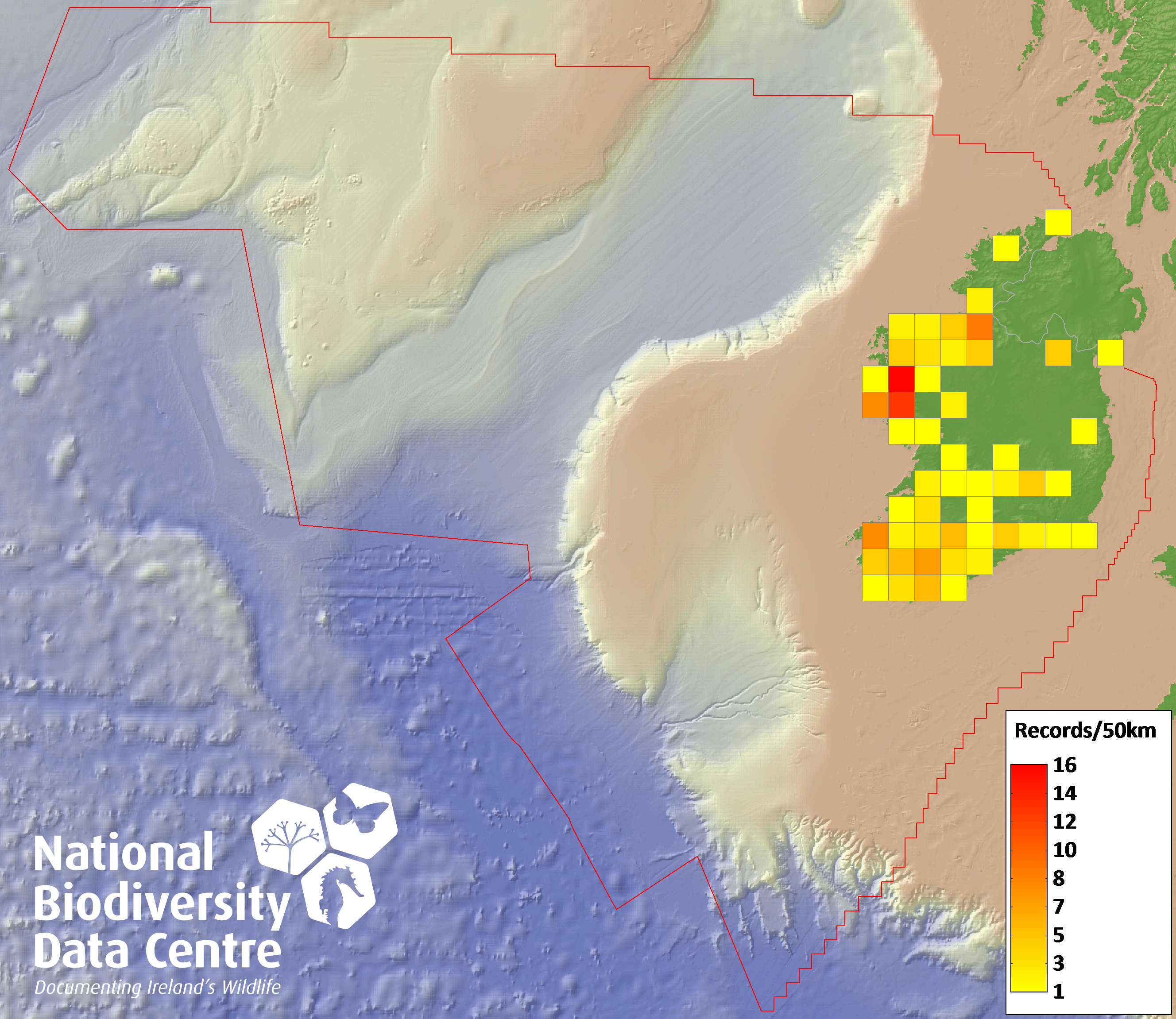 Distribution of the number of records recorded within each 10km grid square (ITM).Marine Map - 50km