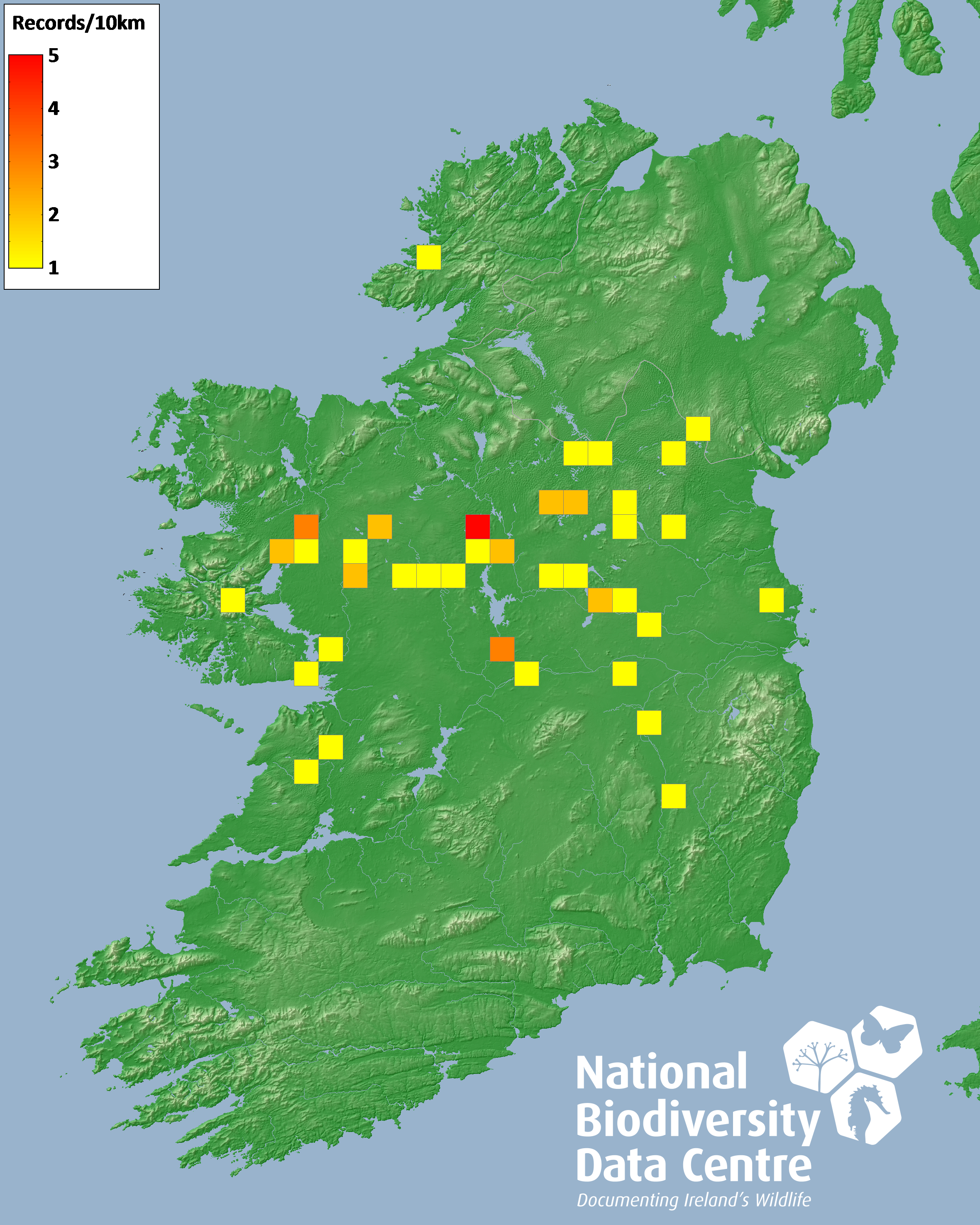 Distribution of the number of records recorded within each 10km grid square (ITM).Marine Map - 50km