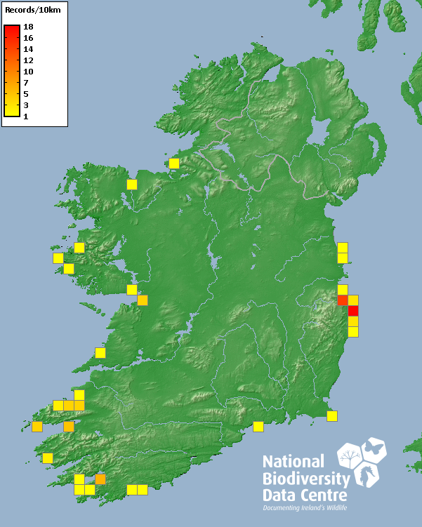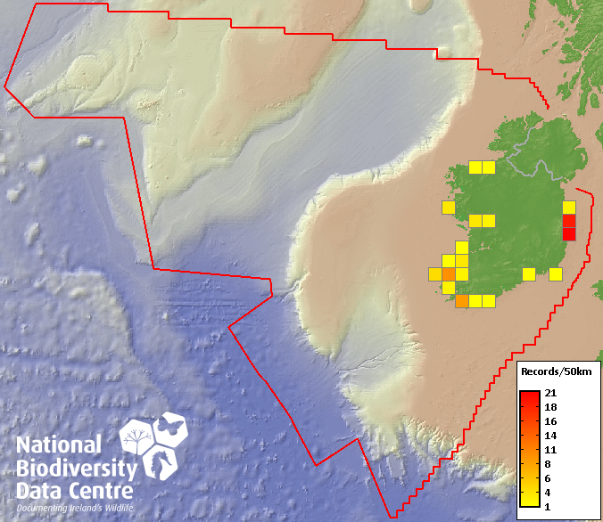 Distribution of the number of records recorded within each 10km grid square (ITM).Marine Map - 50km