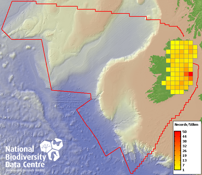 Distribution of the number of records recorded within each 10km grid square (ITM).Marine Map - 50km