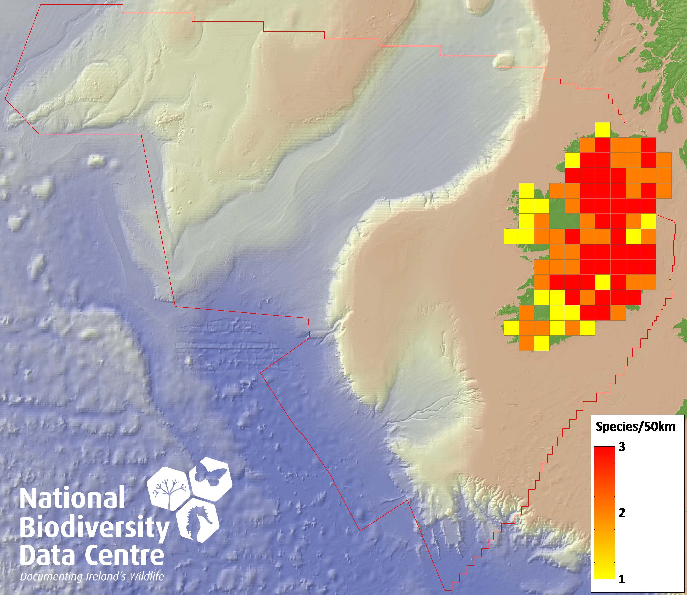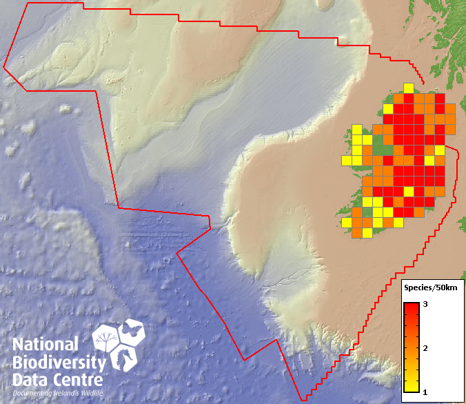 Distribution of the number of species recorded within each 10km grid square (ITM).Marine Map - 50Km