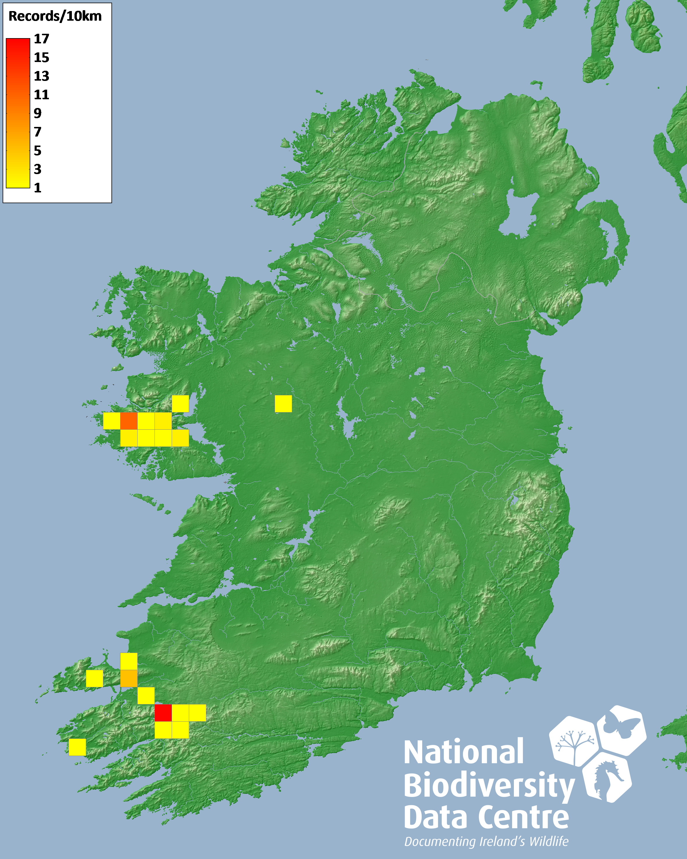 Distribution of the number of records recorded within each 10km grid square (ITM).Marine Map - 50km