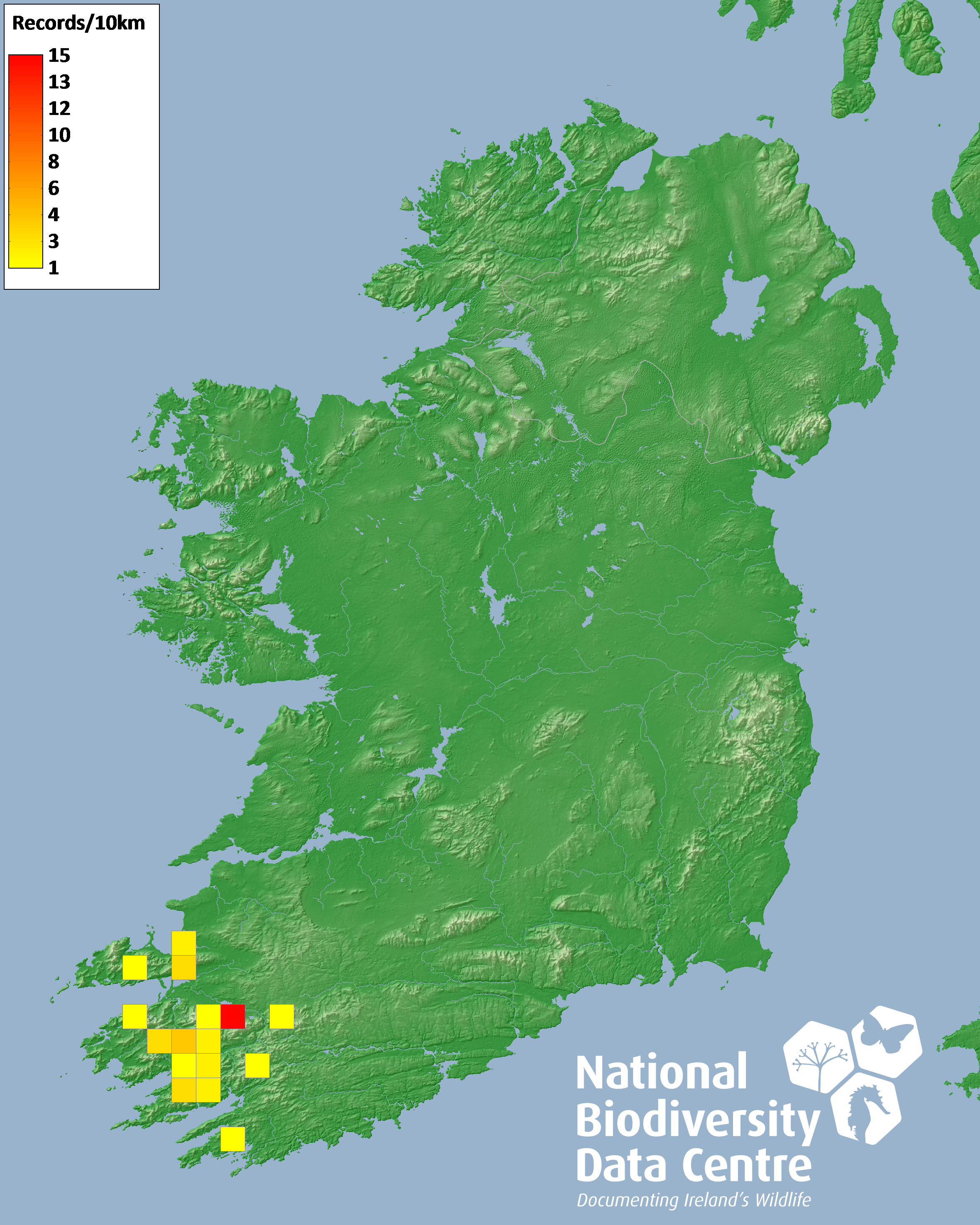 Distribution of the number of records recorded within each 10km grid square (ITM).Marine Map - 50km