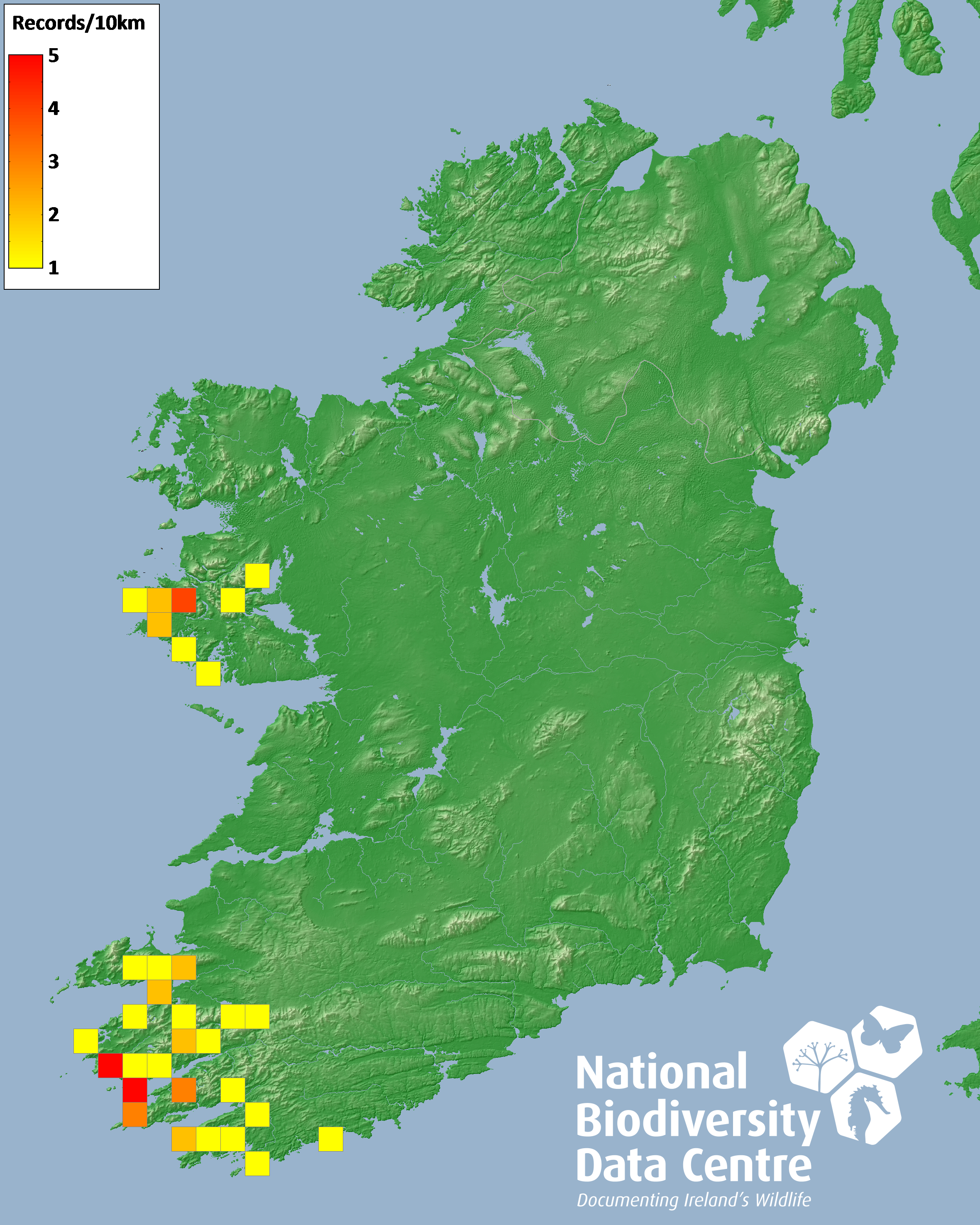 Distribution of the number of records recorded within each 10km grid square (ITM).Marine Map - 50km