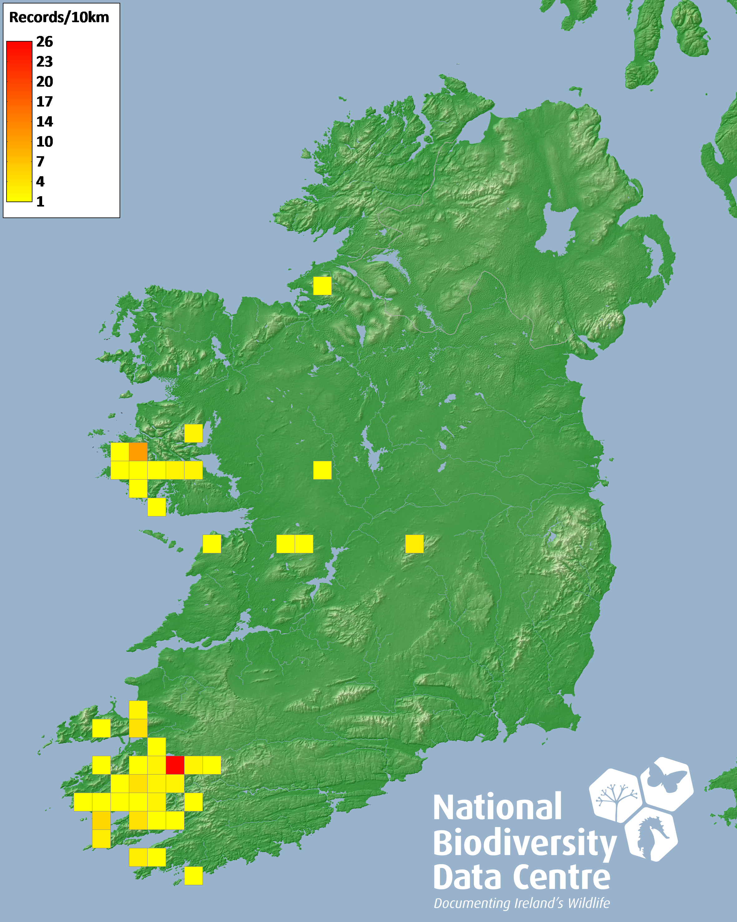 Distribution of the number of records recorded within each 10km grid square (ITM).Marine Map - 50km