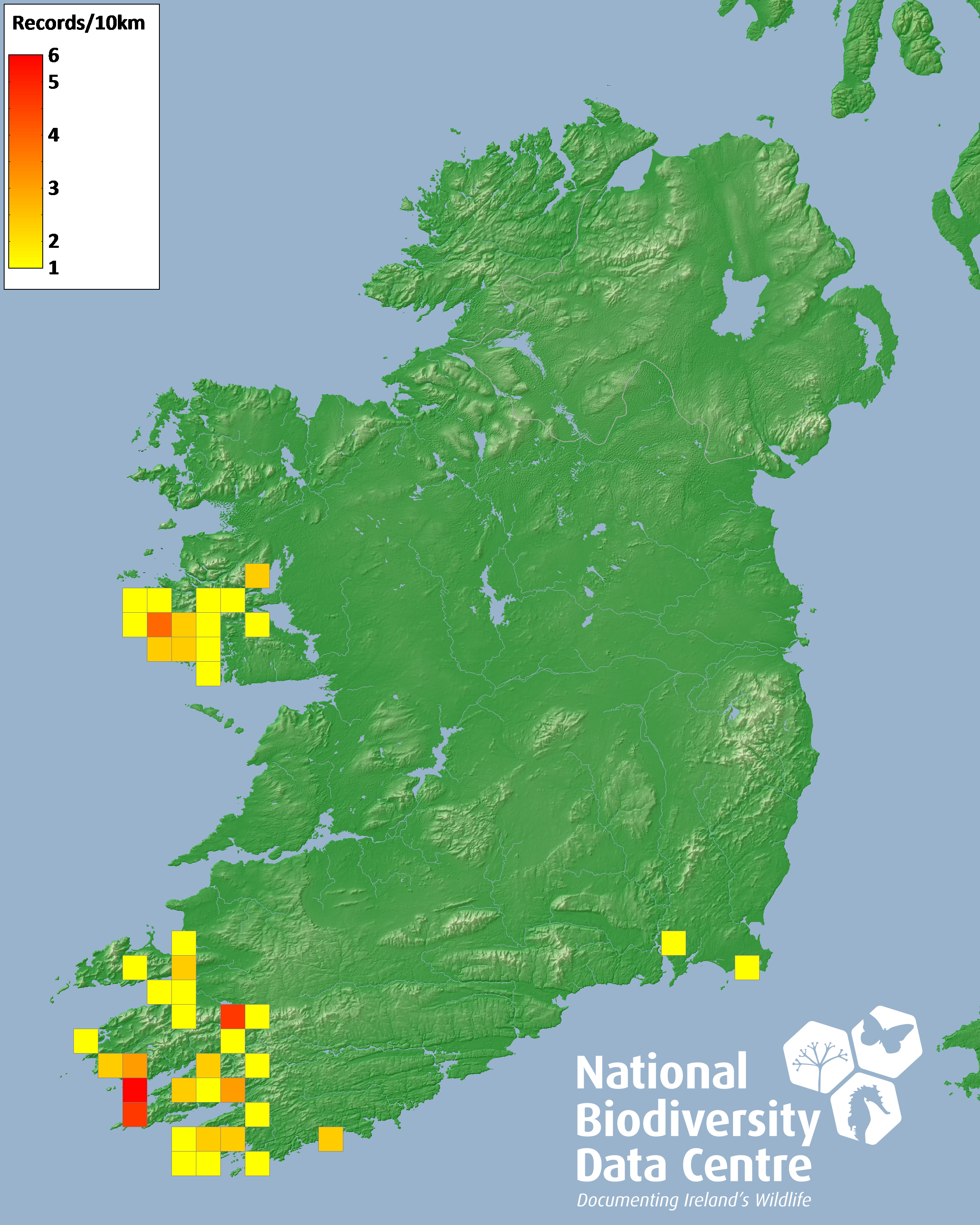 Distribution of the number of records recorded within each 10km grid square (ITM).Marine Map - 50km