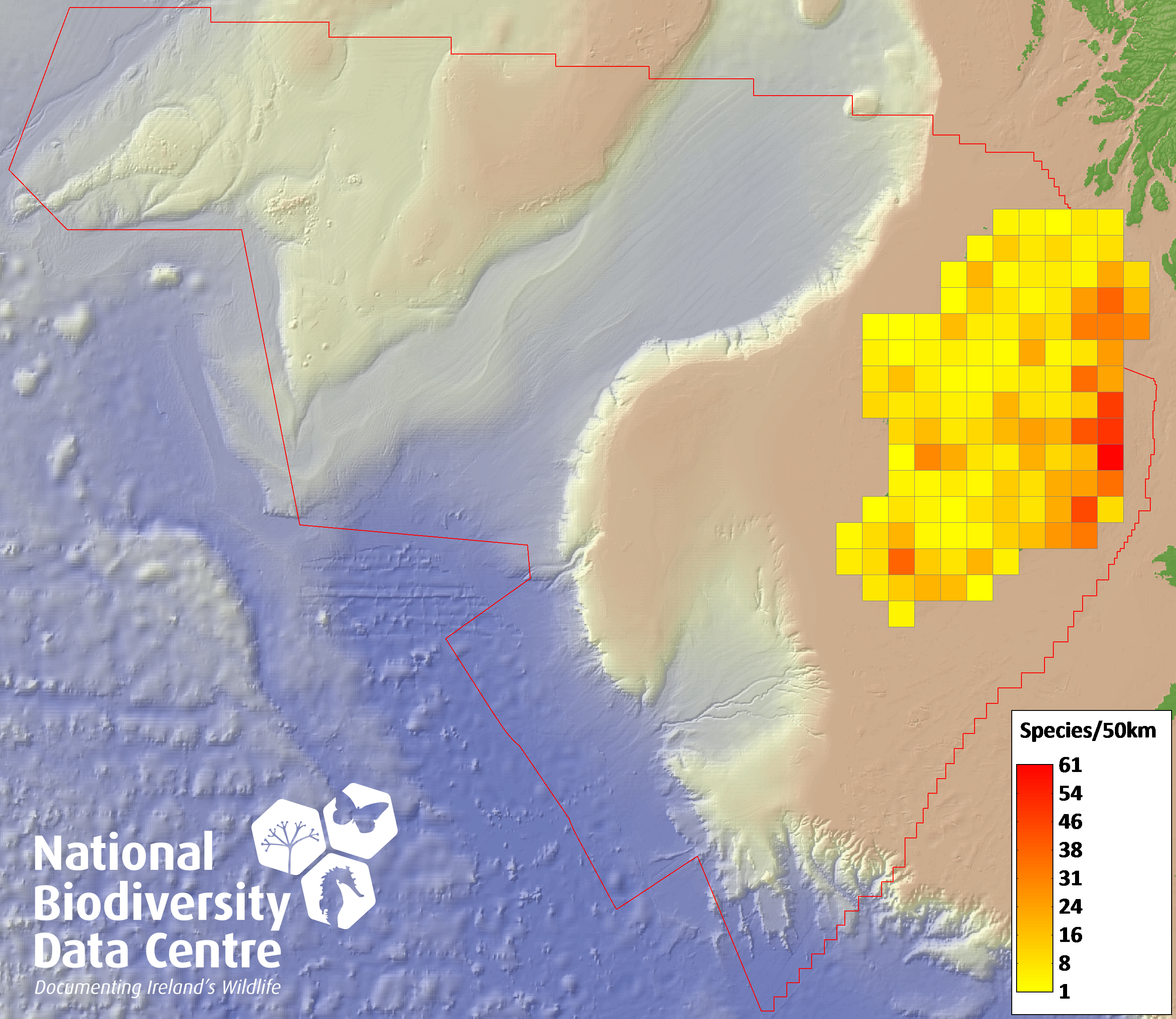 Distribution of the number of species recorded within each 10km grid square (ITM).Marine Map - 50Km