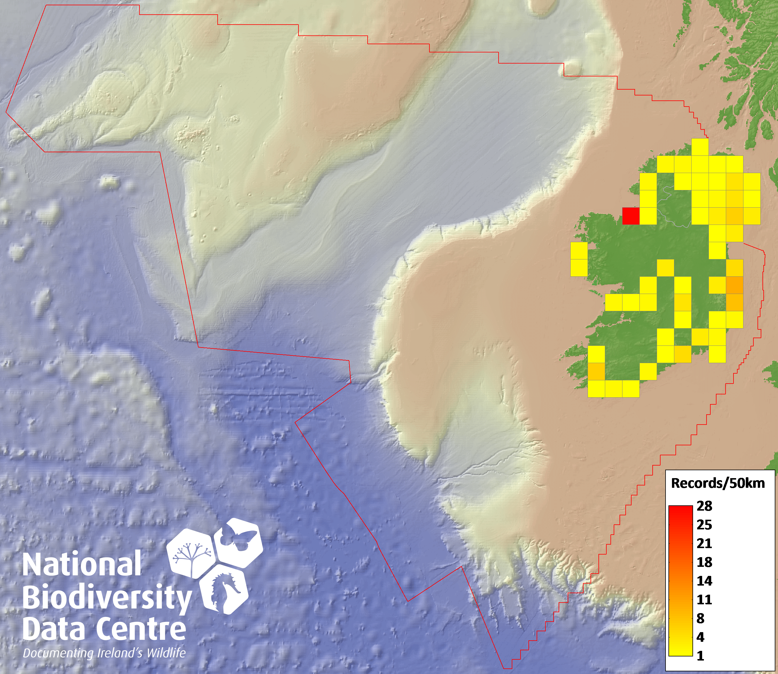 Distribution of the number of records recorded within each 10km grid square (ITM).Marine Map - 50km