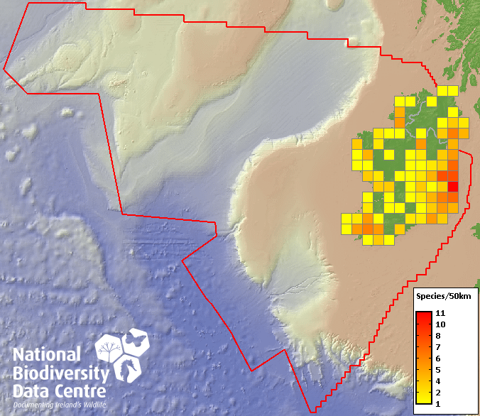 Distribution of the number of species recorded within each 10km grid square (ITM).Marine Map - 50Km