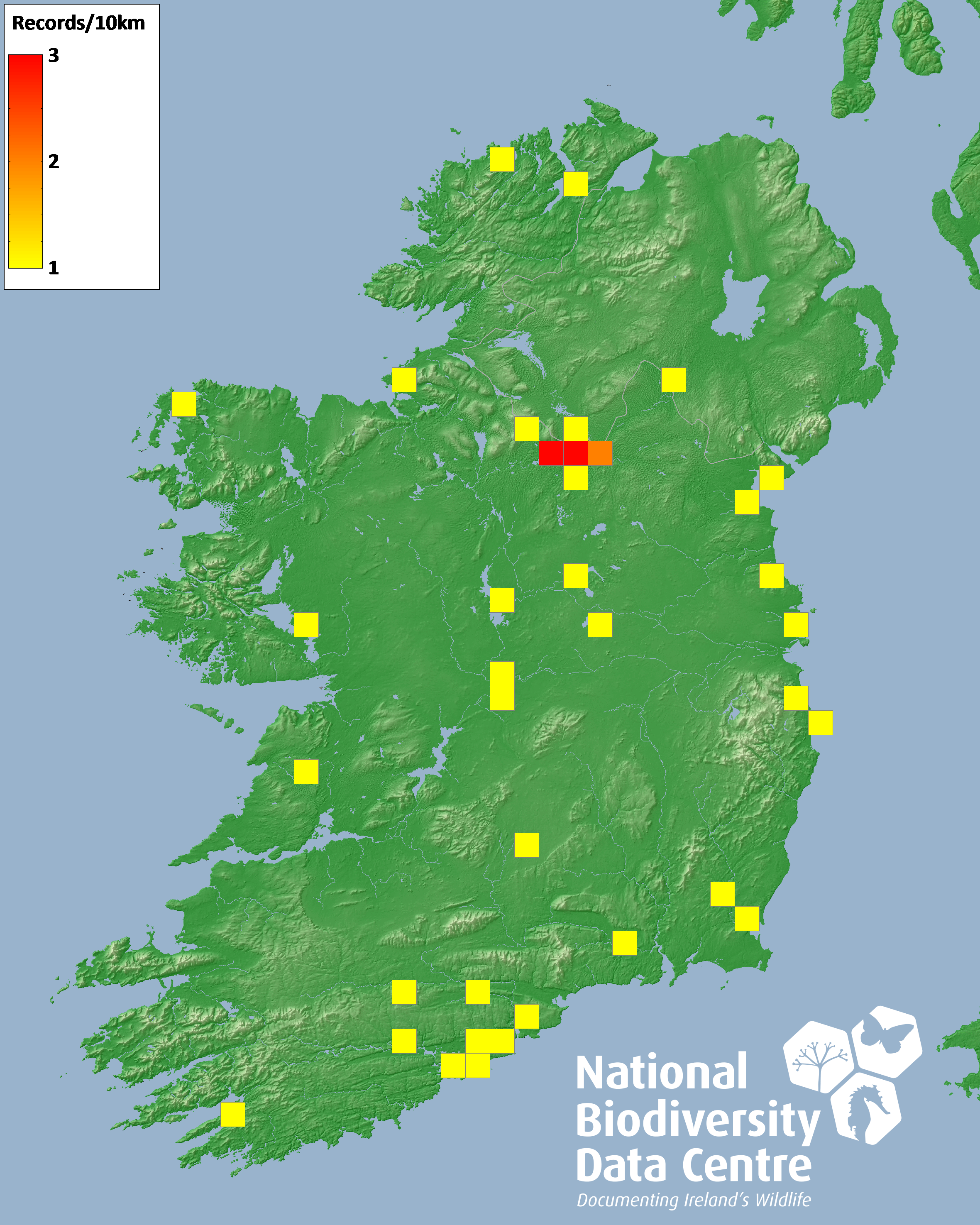 Distribution of the number of records recorded within each 10km grid square (ITM).Marine Map - 50km