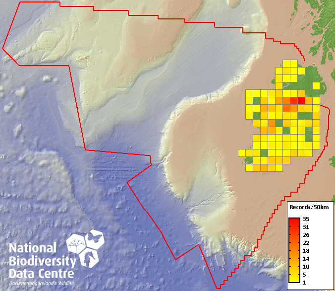 Distribution of the number of records recorded within each 10km grid square (ITM).Marine Map - 50km