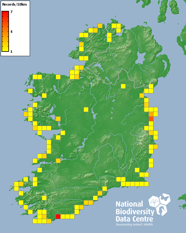 Distribution of the number of records recorded within each 10km grid square (ITM).Marine Map - 50km