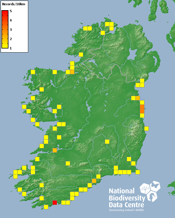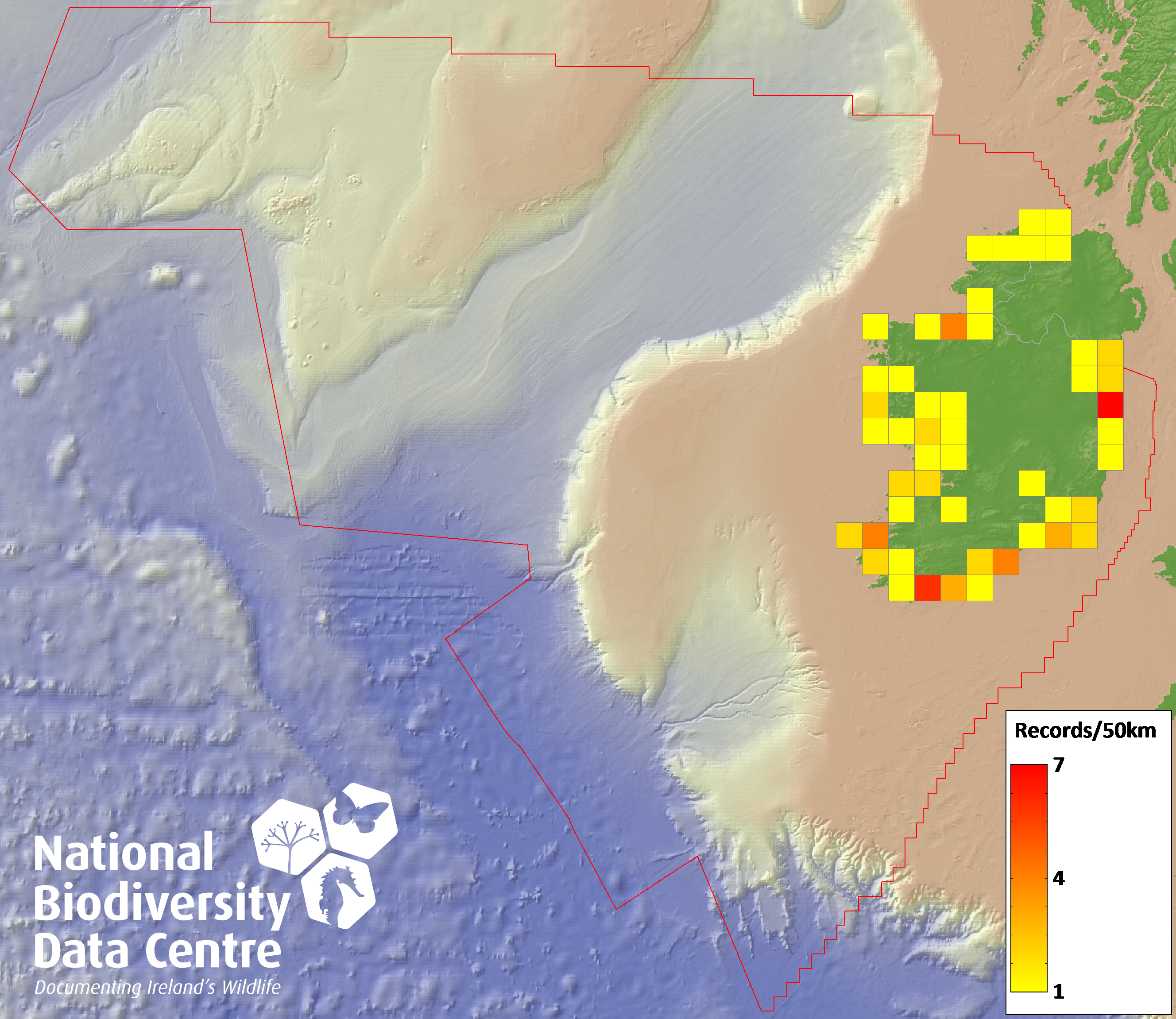 Distribution of the number of records recorded within each 10km grid square (ITM).Marine Map - 50km