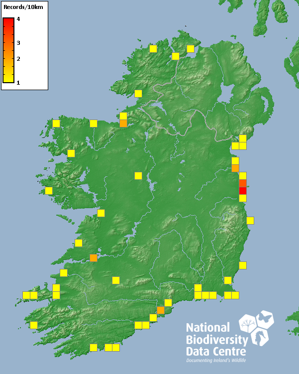 Distribution of the number of records recorded within each 10km grid square (ITM).Marine Map - 50km