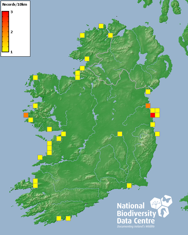 Distribution of the number of records recorded within each 10km grid square (ITM).Marine Map - 50km