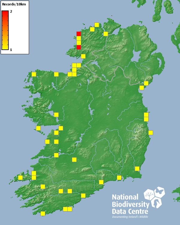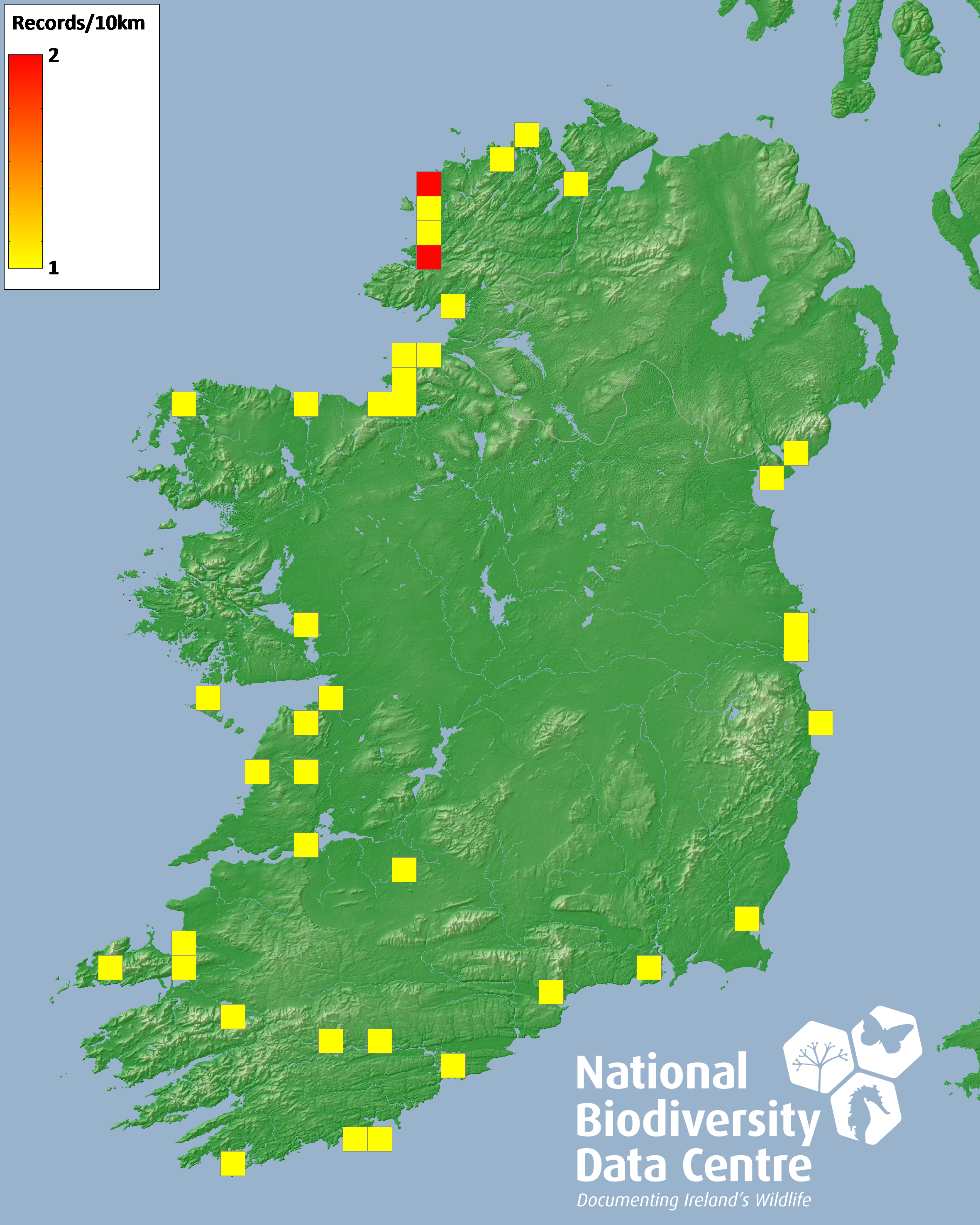 Distribution of the number of records recorded within each 10km grid square (ITM).Marine Map - 50km