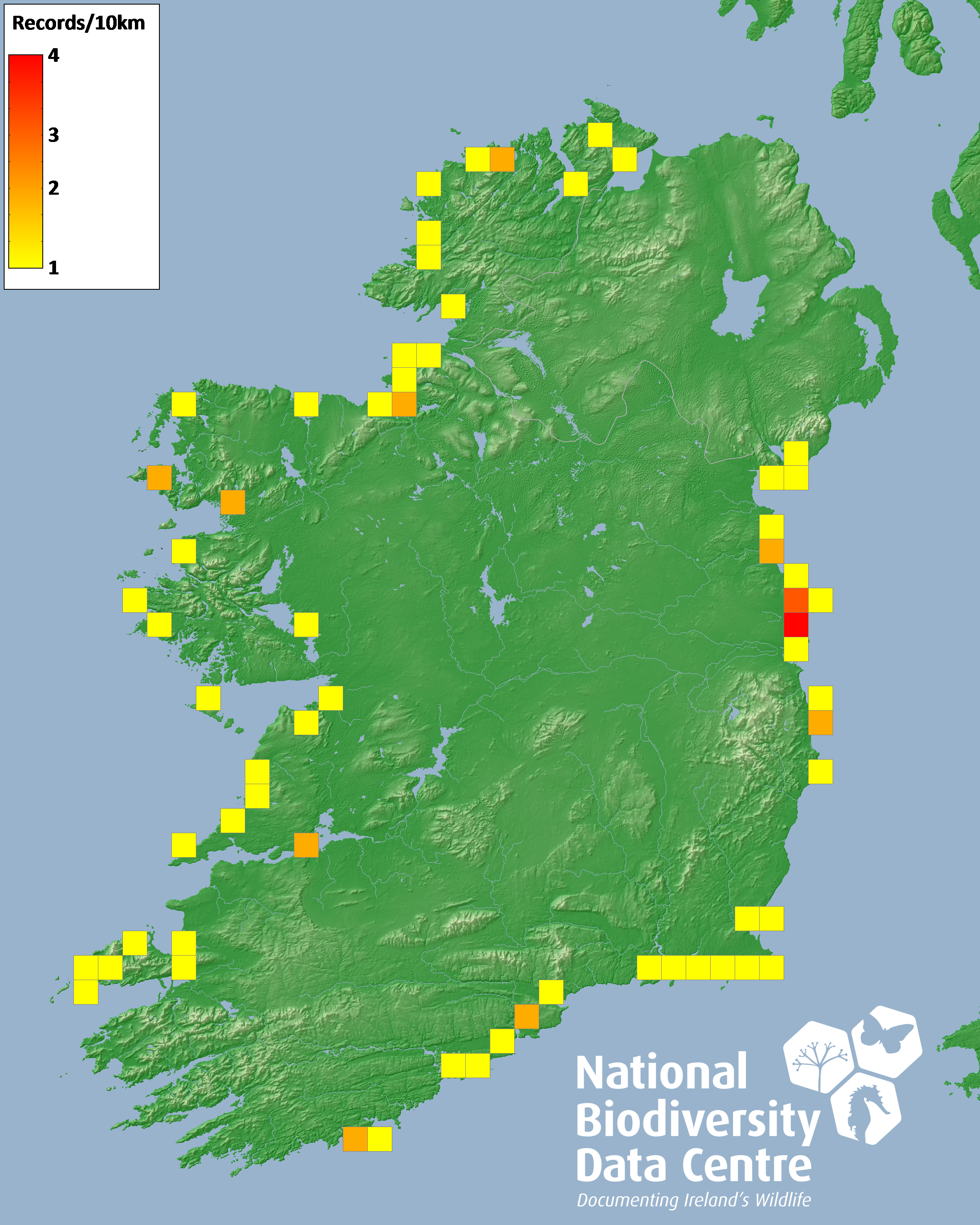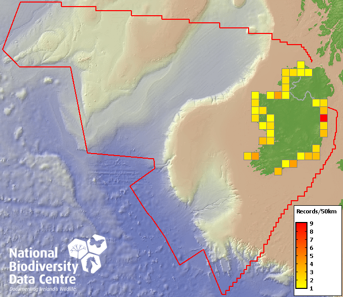 Distribution of the number of records recorded within each 10km grid square (ITM).Marine Map - 50km