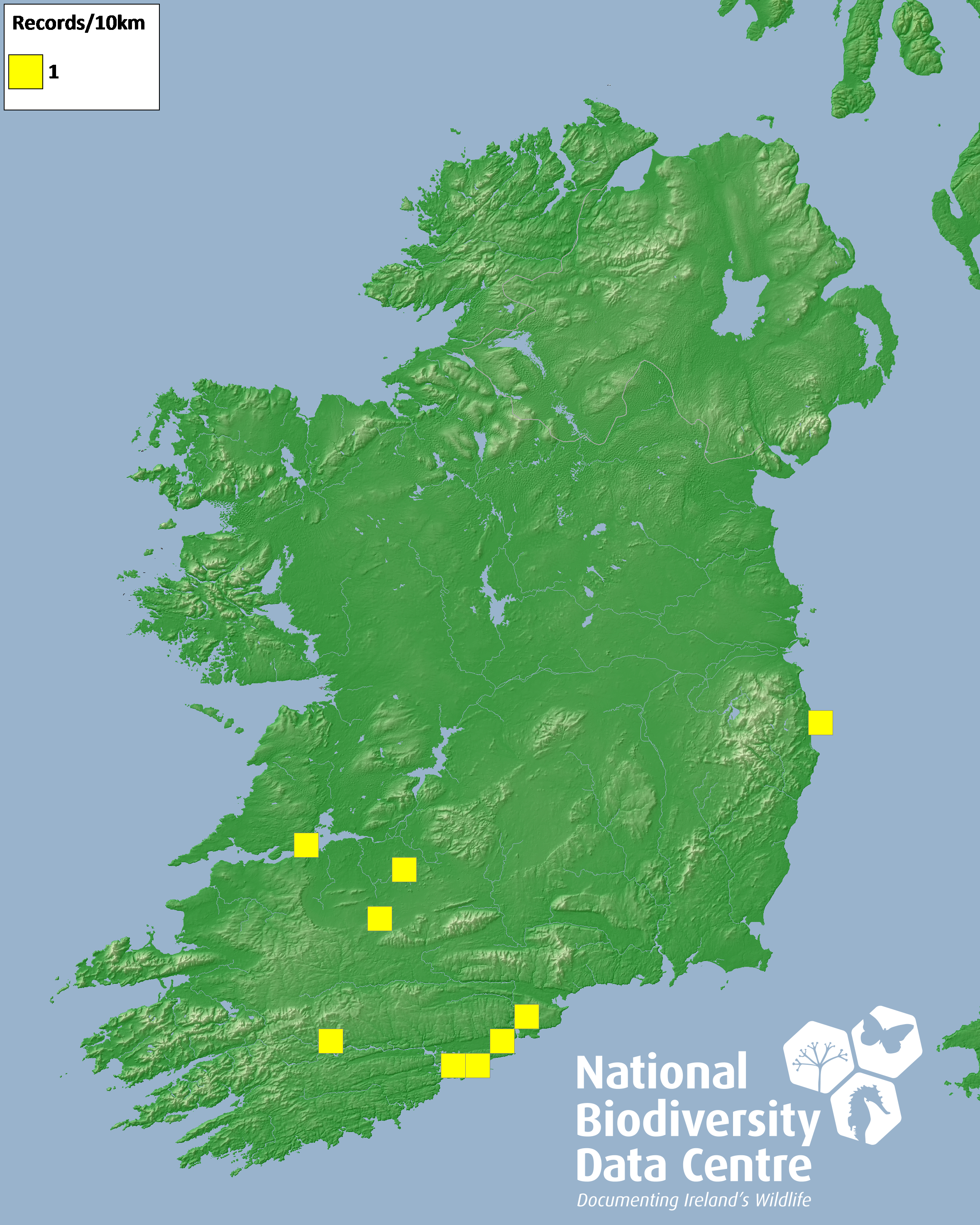 Distribution of the number of records recorded within each 10km grid square (ITM).Marine Map - 50km
