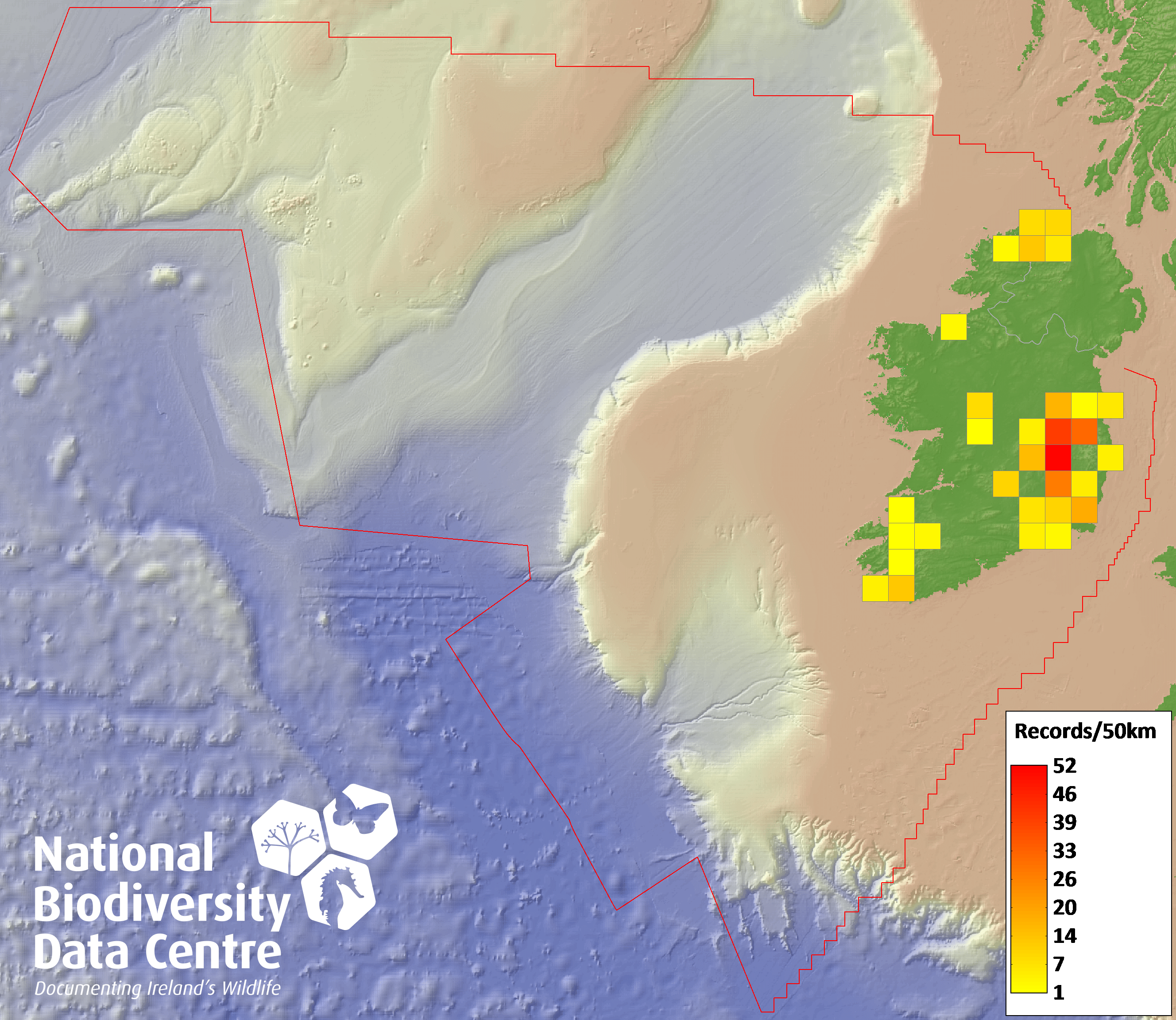 Distribution of the number of records recorded within each 10km grid square (ITM).Marine Map - 50km