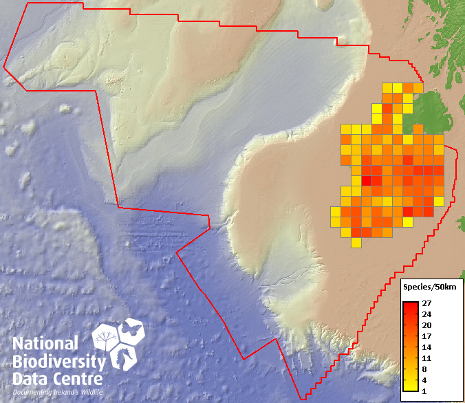 Distribution of the number of species recorded within each 10km grid square (ITM).Marine Map - 50Km