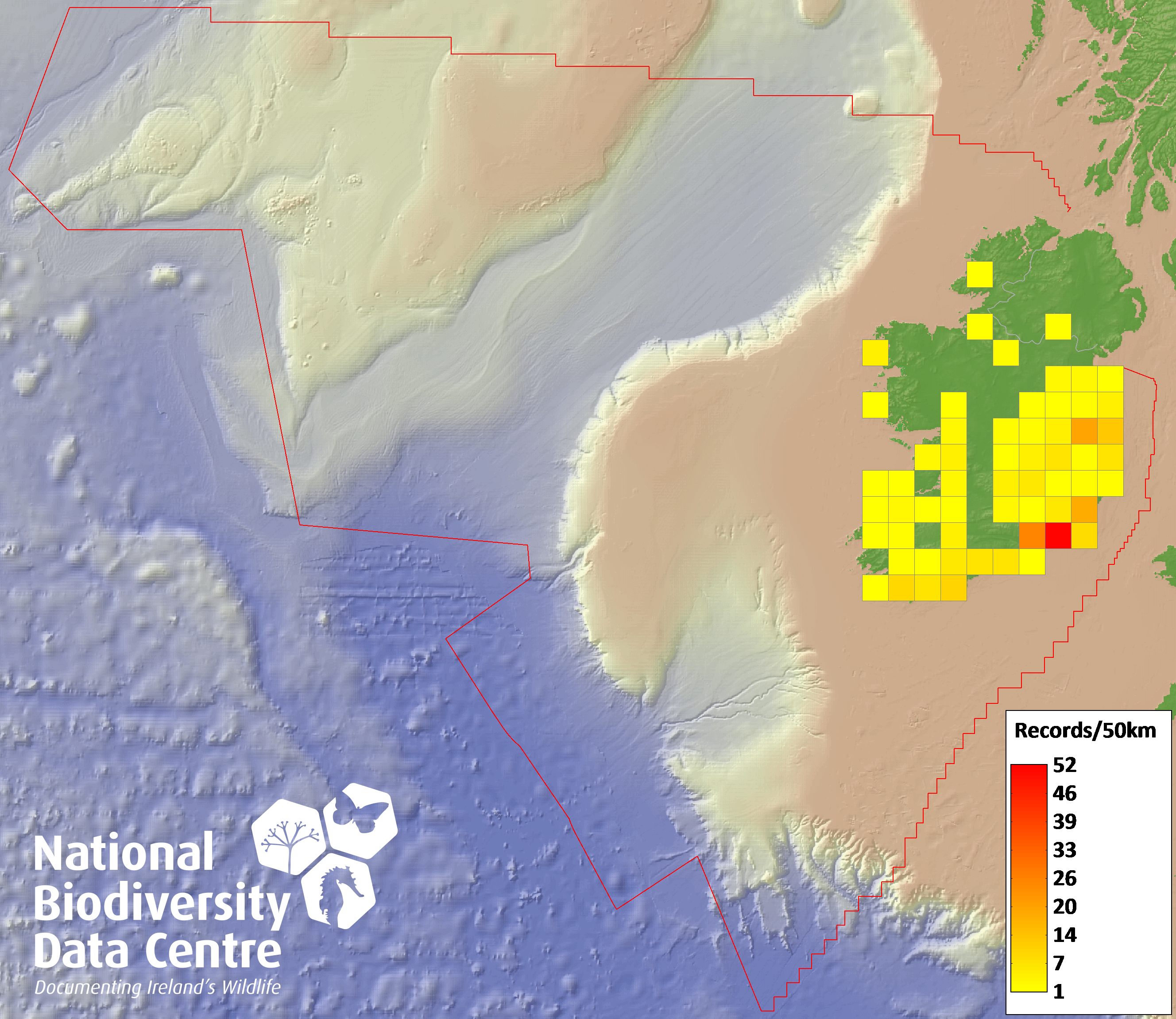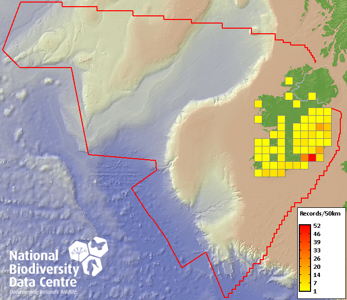 Distribution of the number of records recorded within each 10km grid square (ITM).Marine Map - 50km