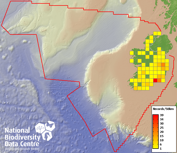 Distribution of the number of records recorded within each 10km grid square (ITM).Marine Map - 50km