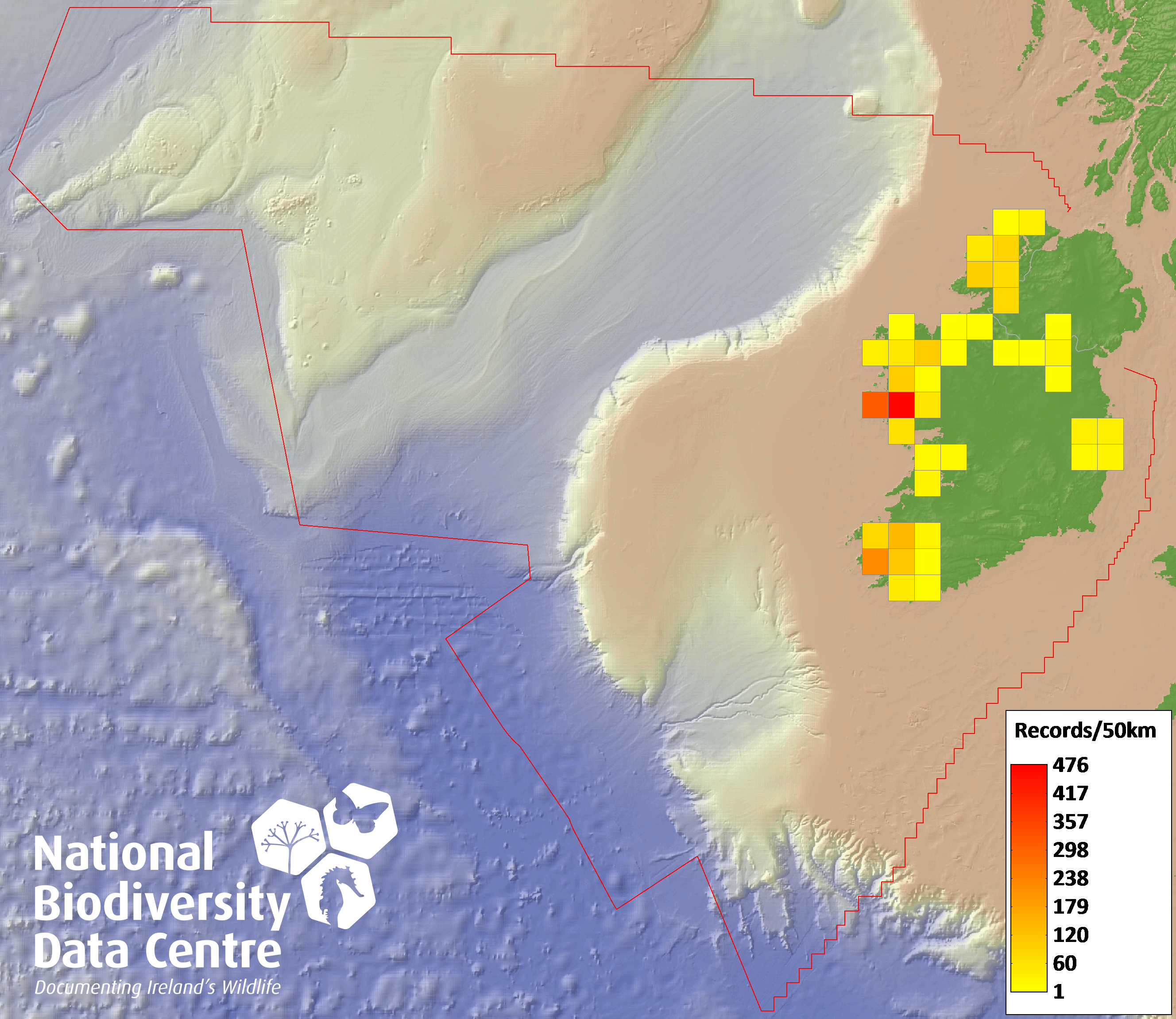 Distribution of the number of records recorded within each 10km grid square (ITM).Marine Map - 50km