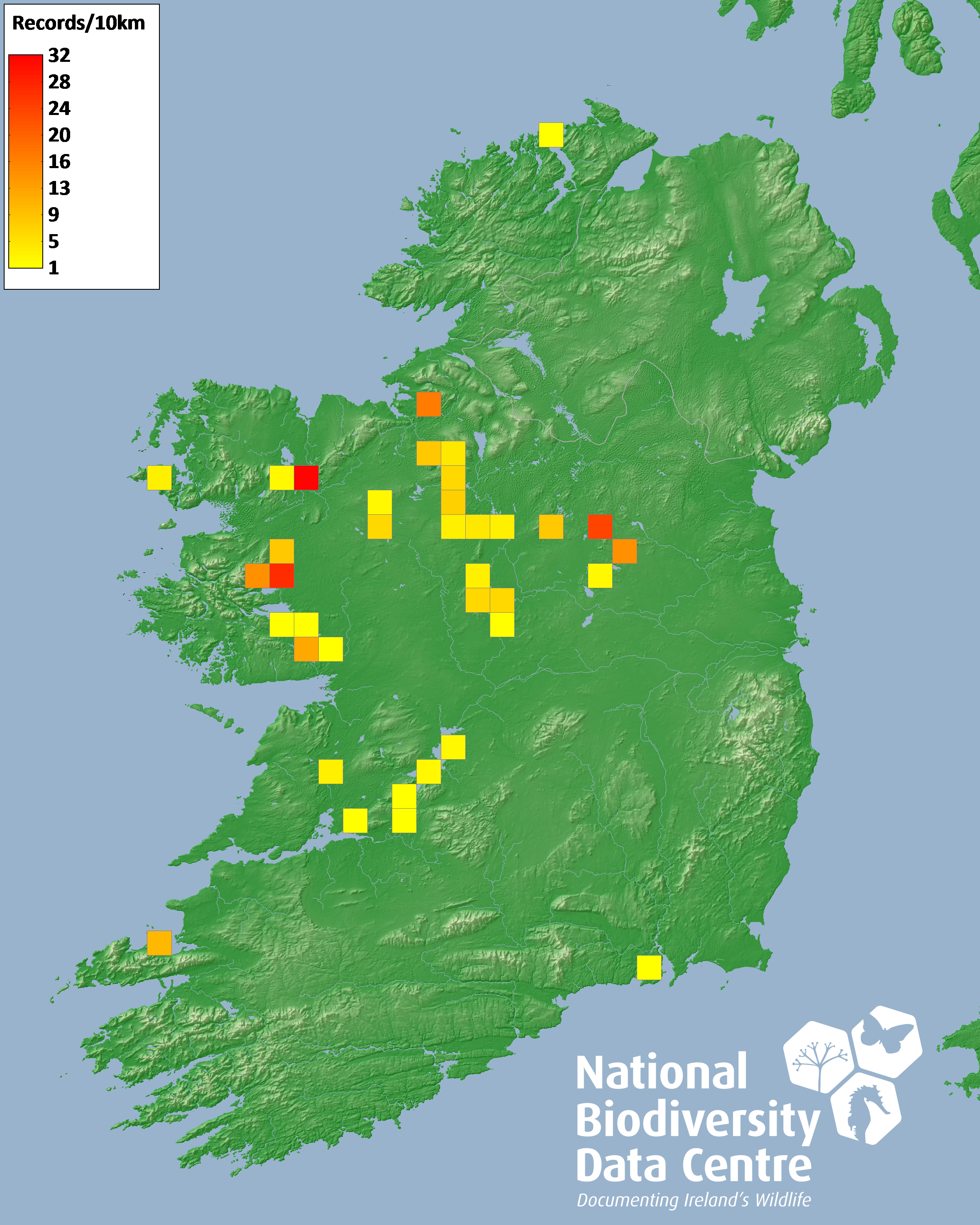Distribution of the number of records recorded within each 10km grid square (ITM).Marine Map - 50km