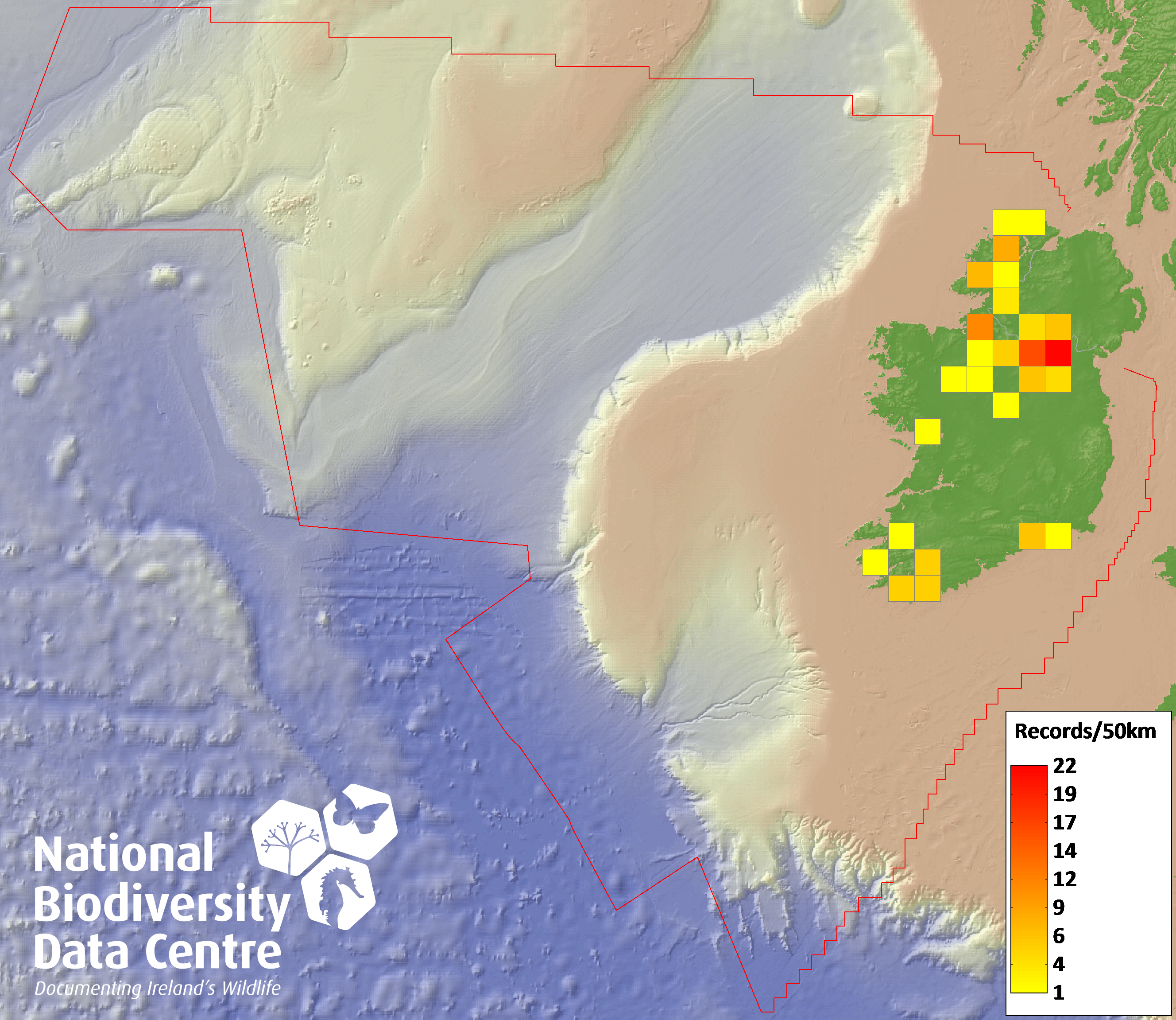 Distribution of the number of records recorded within each 10km grid square (ITM).Marine Map - 50km