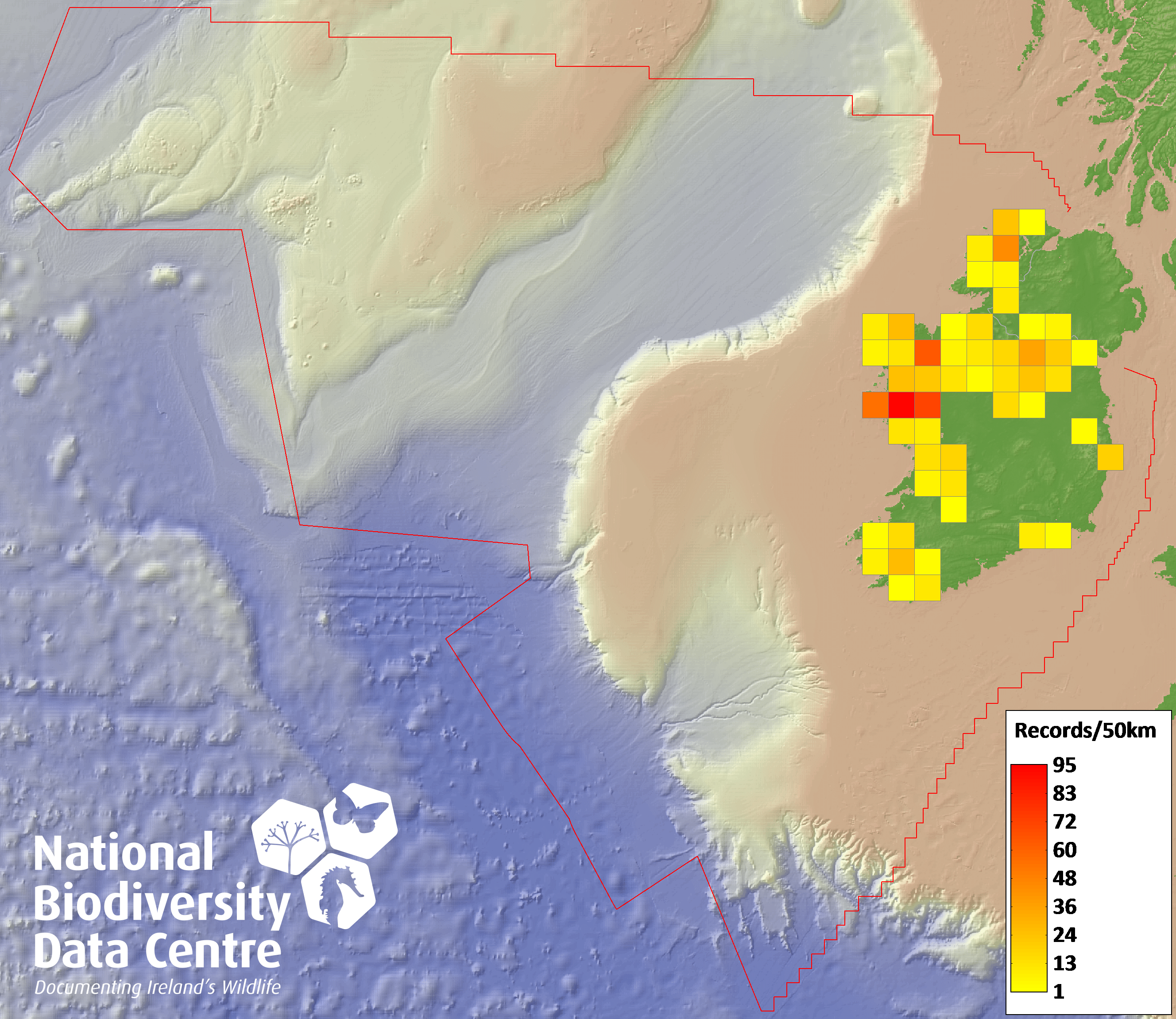 Distribution of the number of records recorded within each 10km grid square (ITM).Marine Map - 50km