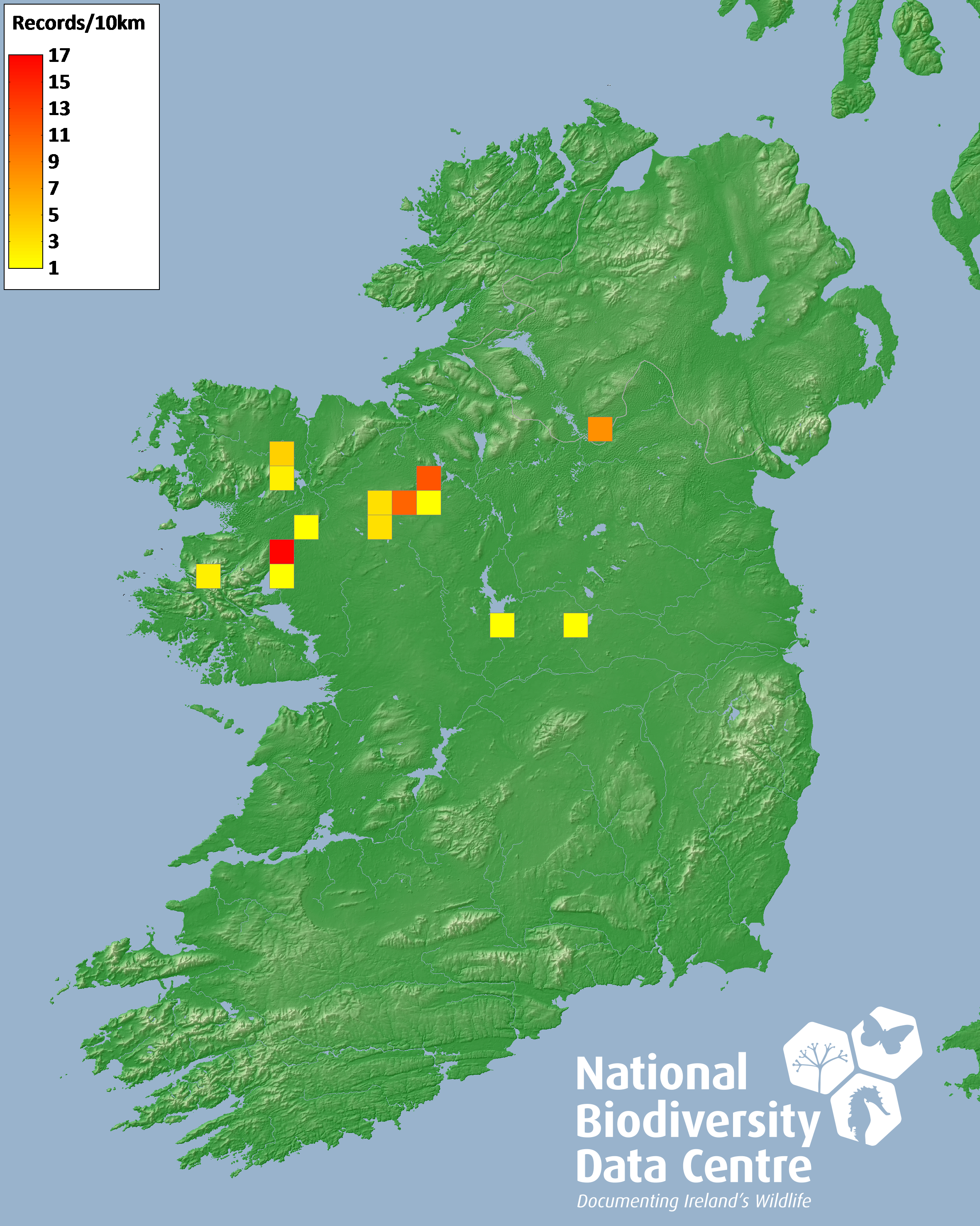 Distribution of the number of records recorded within each 10km grid square (ITM).Marine Map - 50km