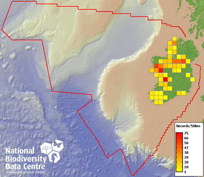 Distribution of the number of records recorded within each 10km grid square (ITM).Marine Map - 50km