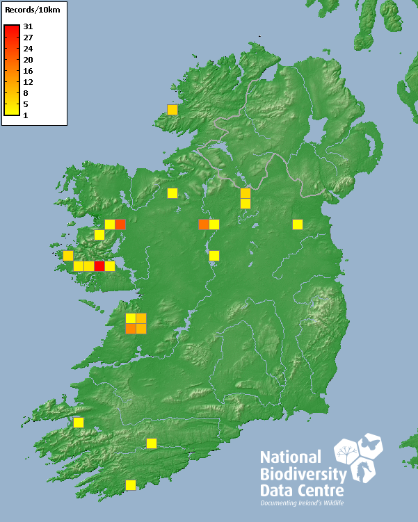 Distribution of the number of records recorded within each 10km grid square (ITM).Marine Map - 50km