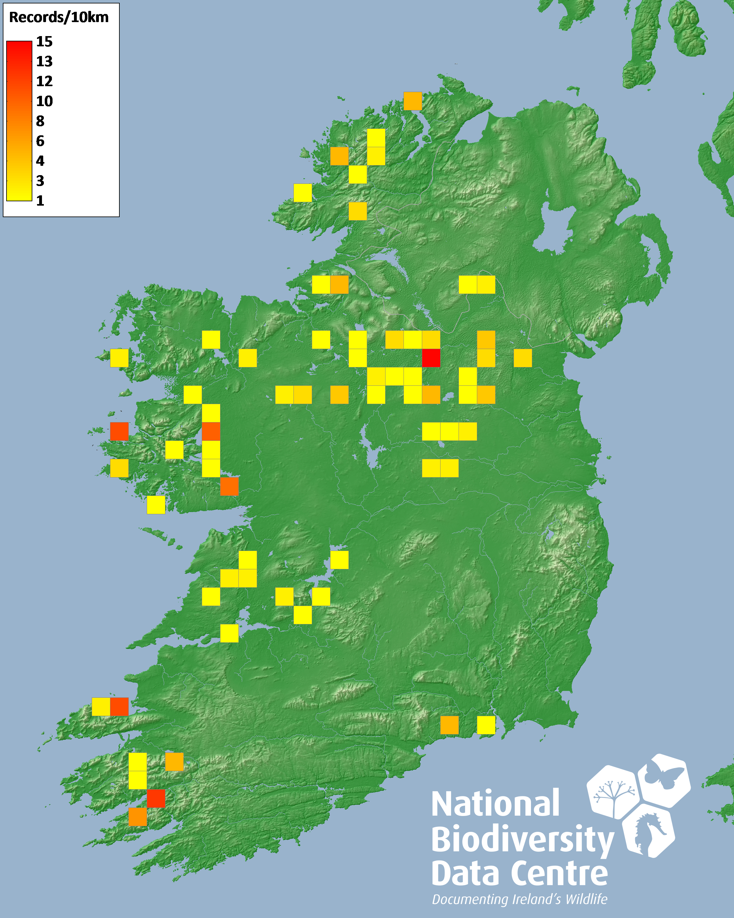 Distribution of the number of records recorded within each 10km grid square (ITM).Marine Map - 50km